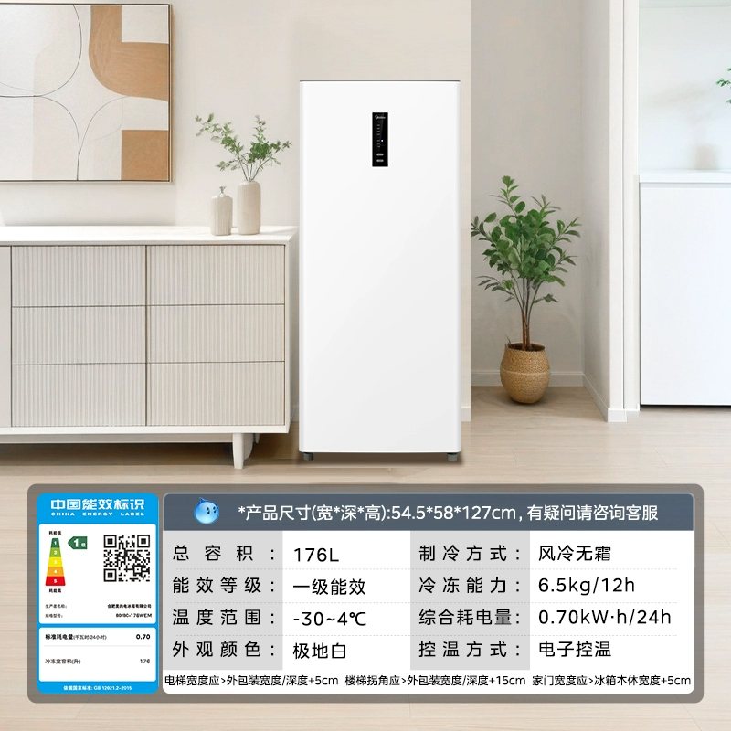 美的176L立式冰柜家用小型一级冷冻冷藏柜风冷无霜冷柜母乳小冰箱