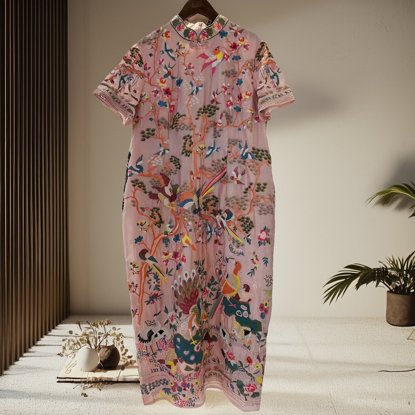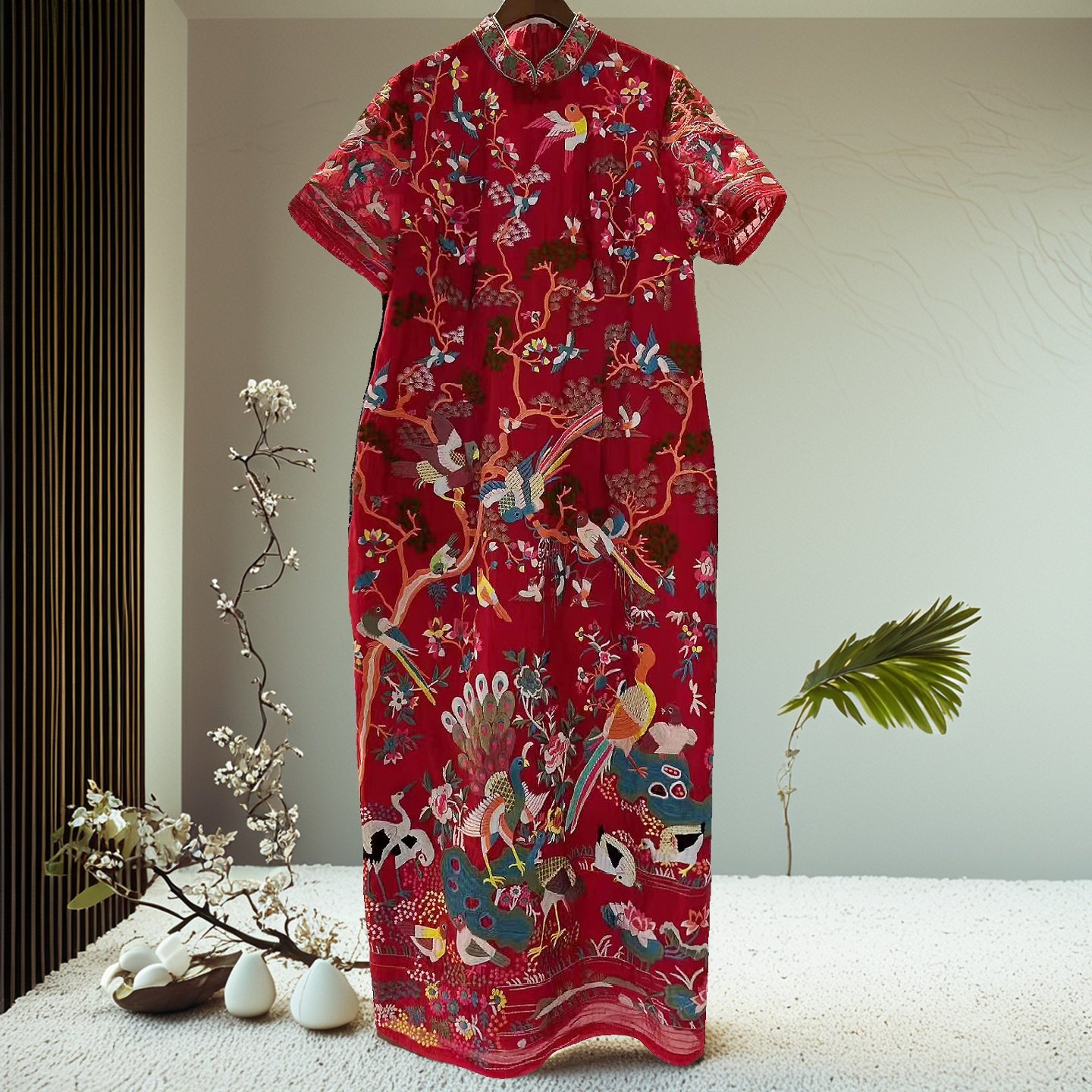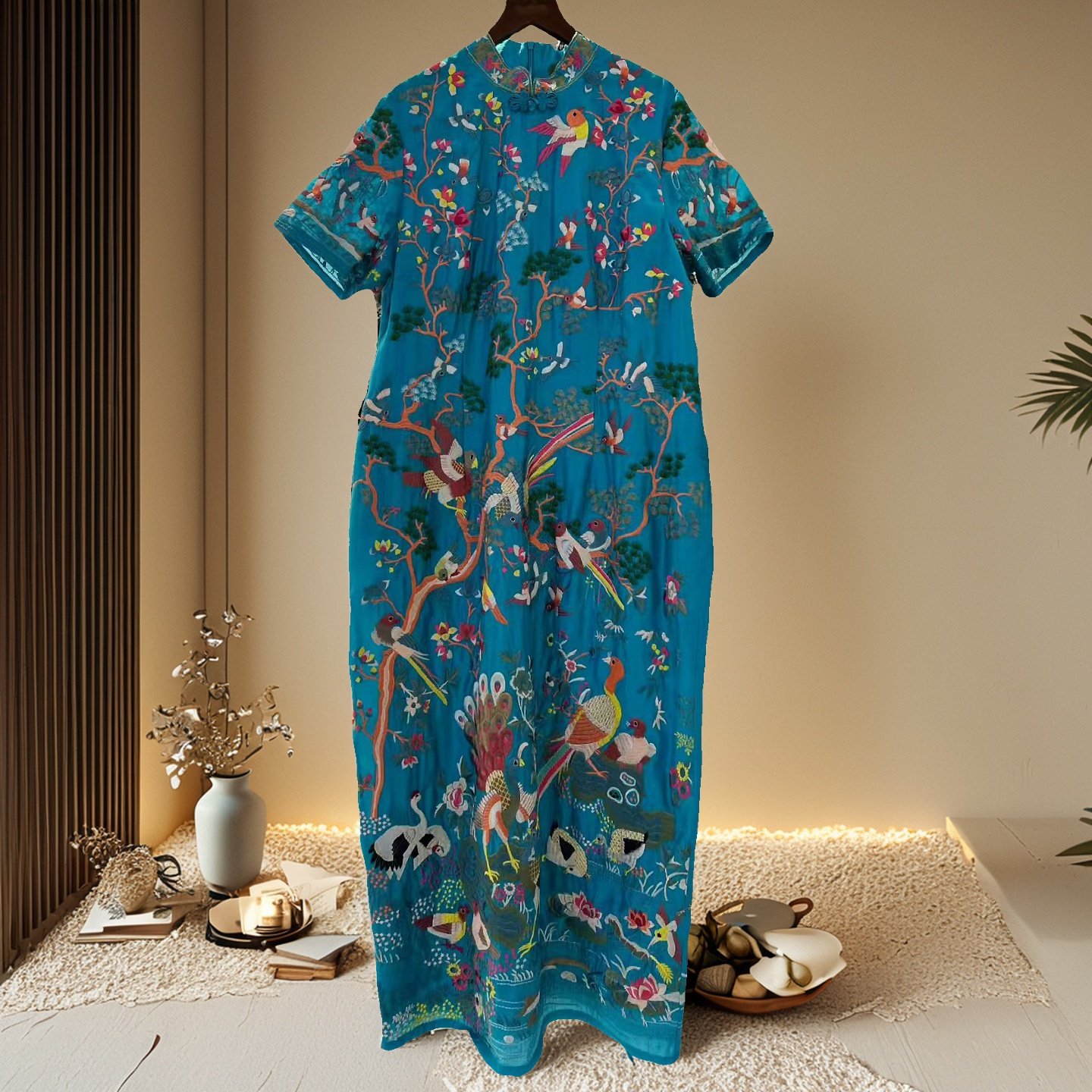 新中式国风连衣裙轻奢高级感安娜滕花鸟刺绣天丝大码显瘦改良旗袍
