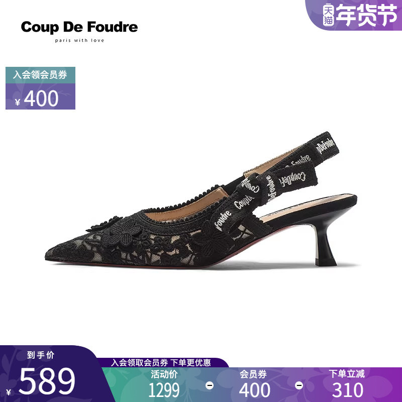 CDF女鞋轻奢夏季新款百搭真皮羊反绒蕾丝花朵性感尖头包头凉鞋女