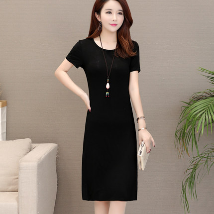莫代尔短袖中长款T恤裙过膝宽松大码胖mm打底连衣裙夏上衣打底衫