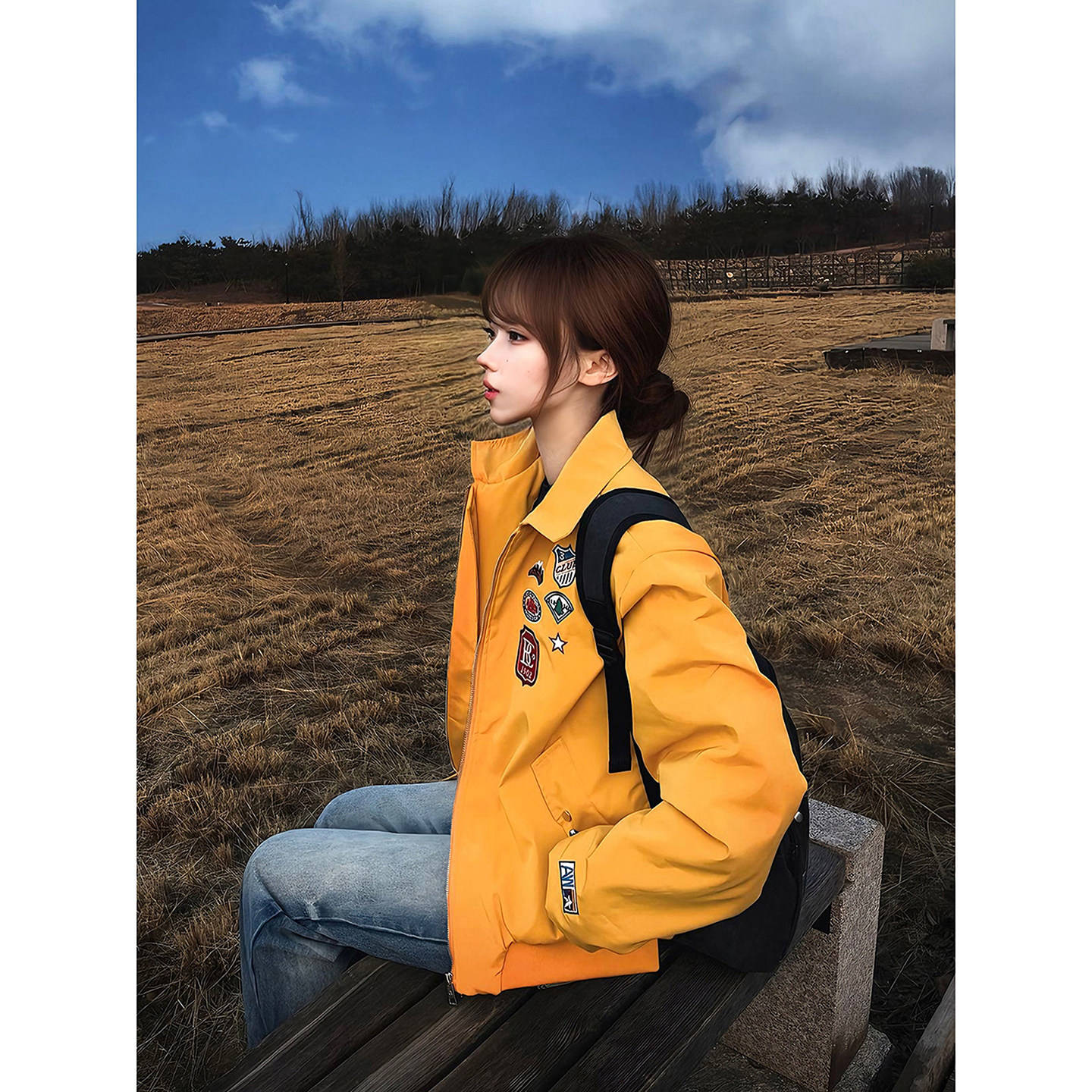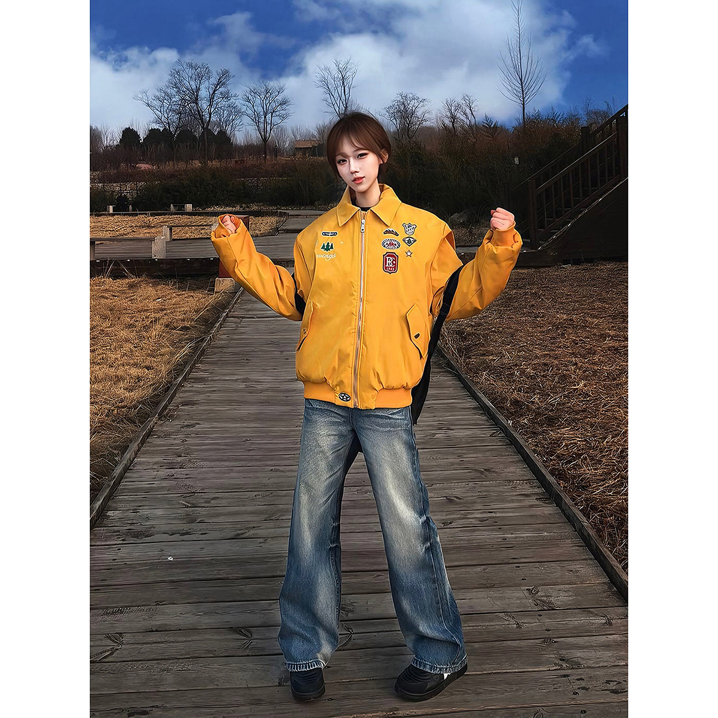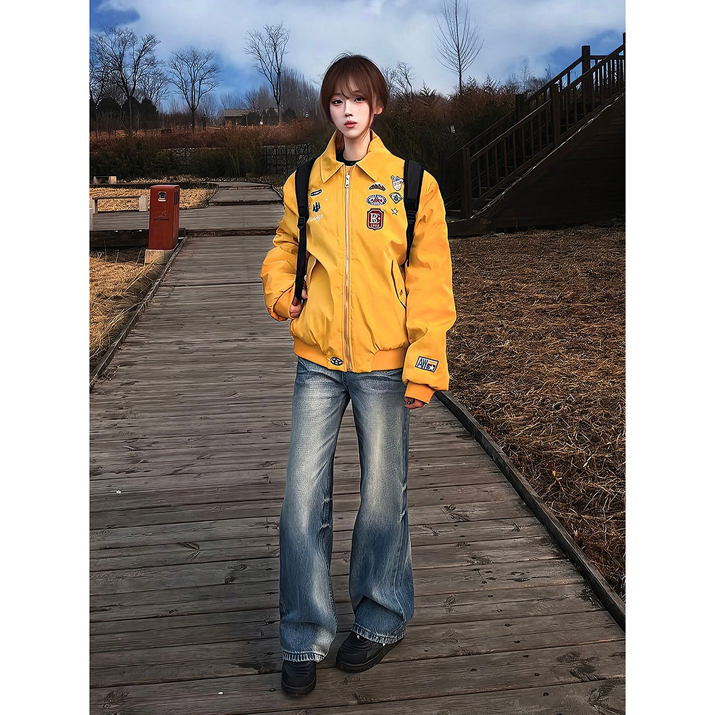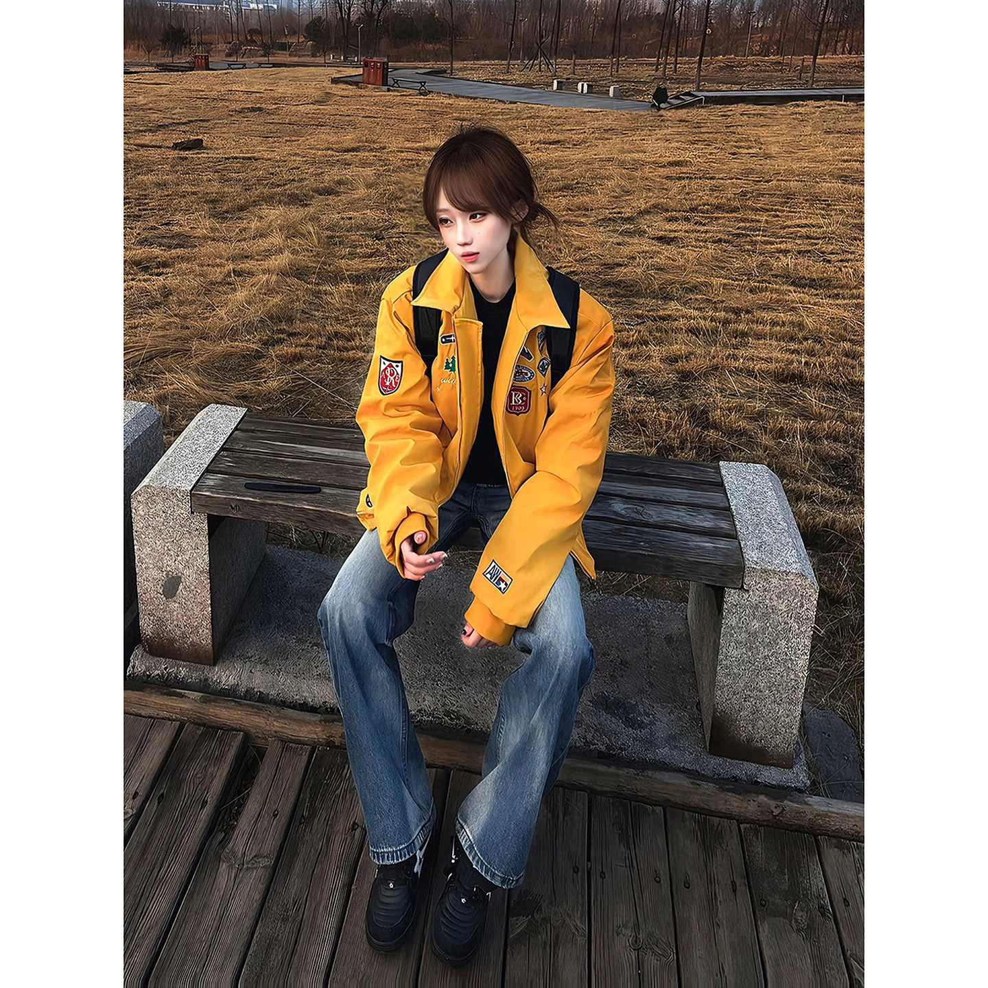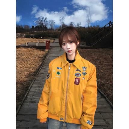 亮黄色徽章刺绣短款外套男款春季少年感机车骑行服设计感飞行夹克
