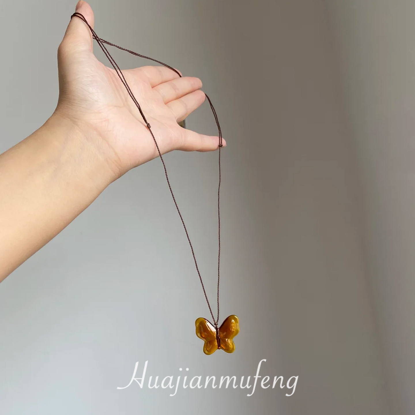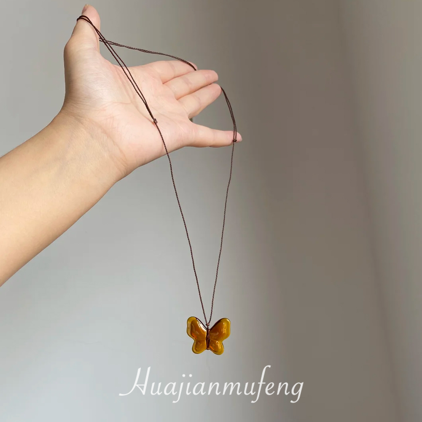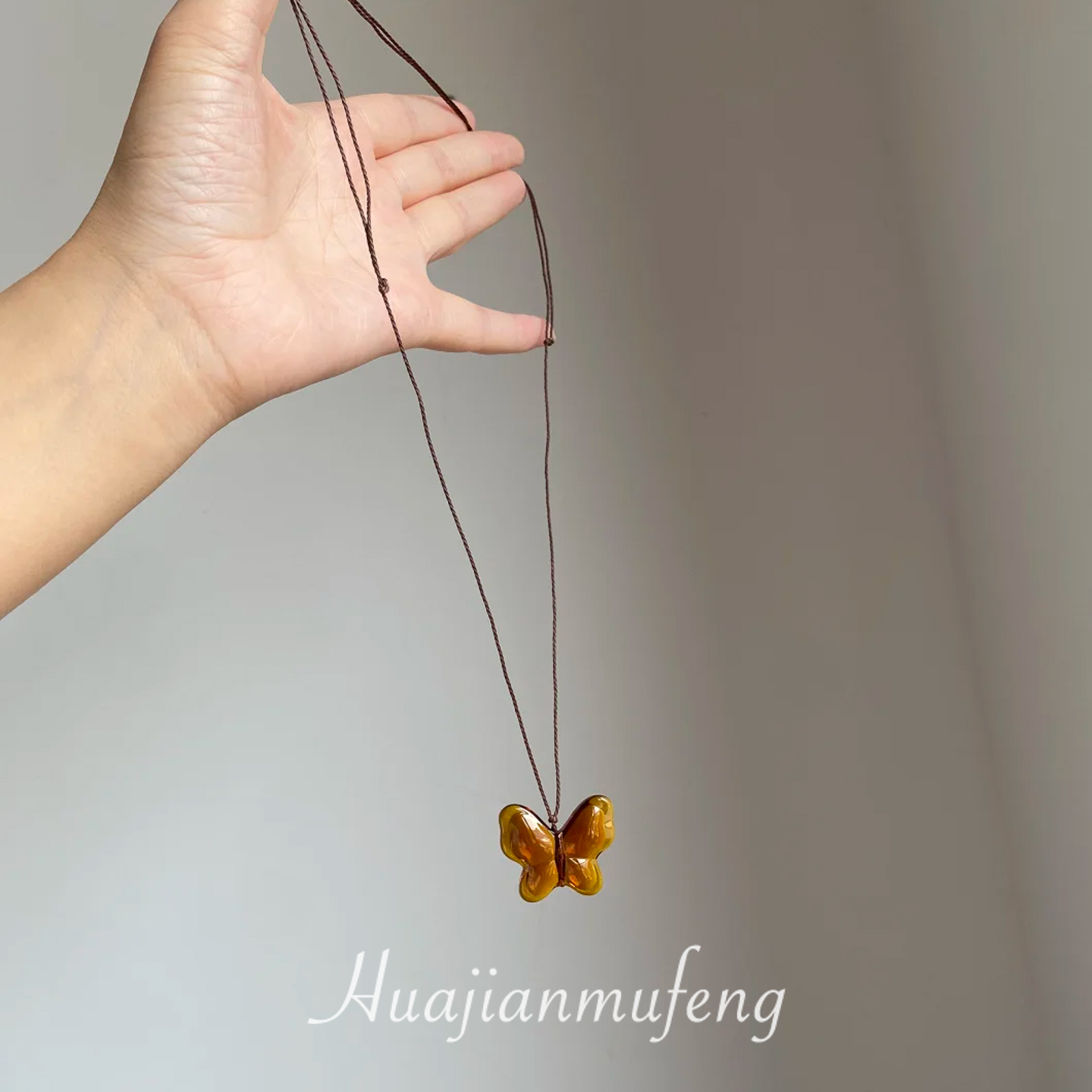 新中式琥珀焦糖色蝴蝶吊坠项链民族风百搭毛衣链长款秋冬复古配饰