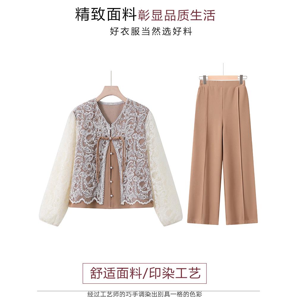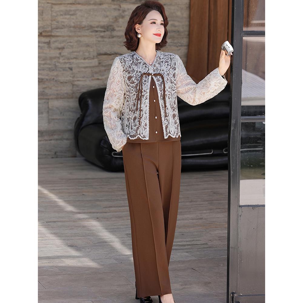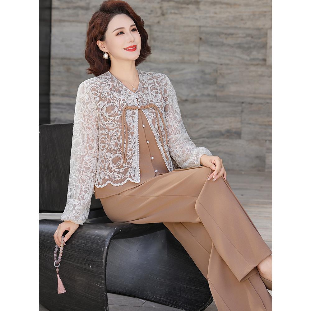 妈妈春秋蕾丝套装2025新款洋气减龄中老年女装气质上衣裤子两件套