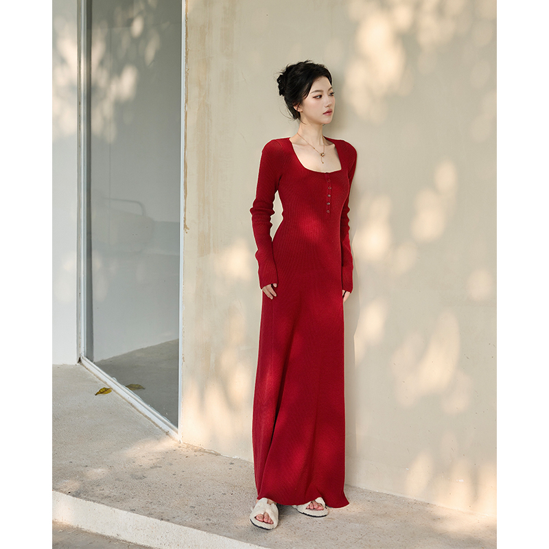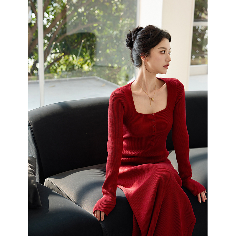 SerioLudere蛋仔很懒 方领修身红色一字领内搭百搭打底针织连衣裙