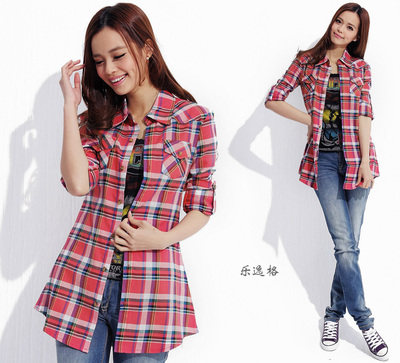 长袖纯棉格子衬衫中长款韩系修身