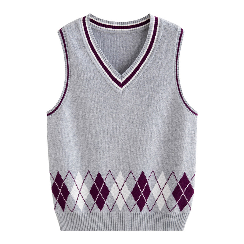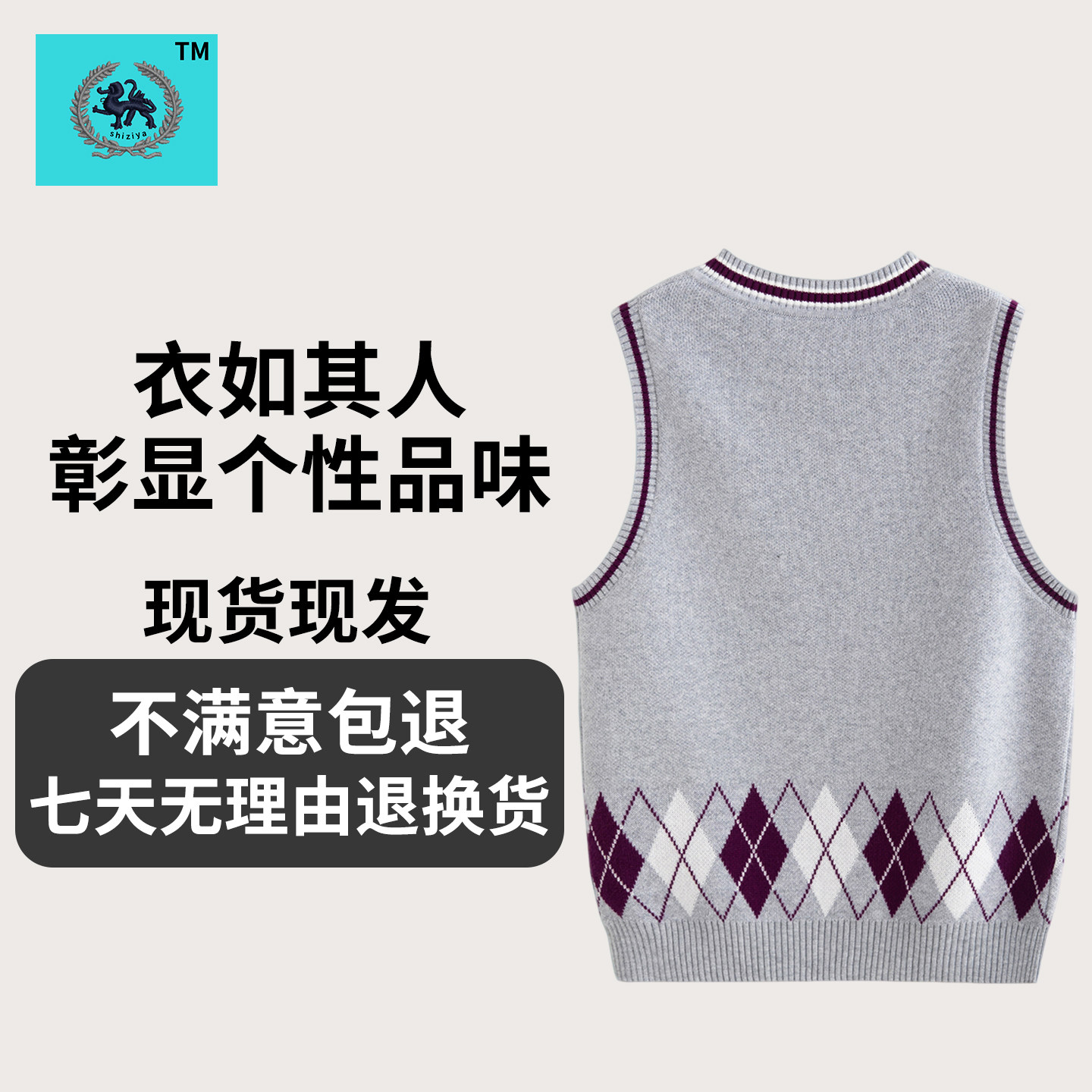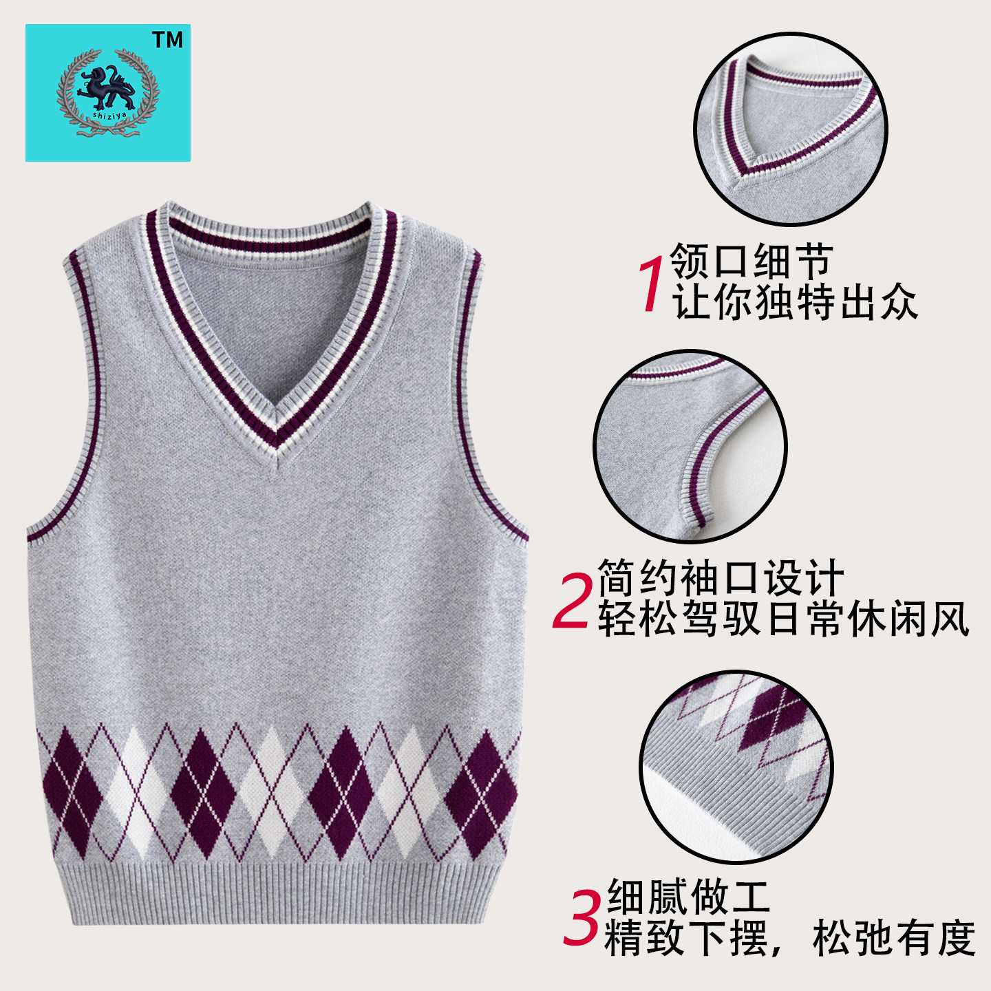儿童灰色马甲男童秋冬毛衣全棉毛线女童菱格坎肩学生校服针织背心