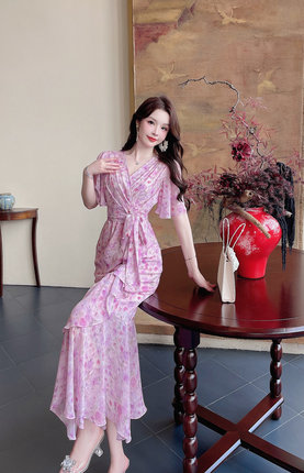 气质女人味真丝印花鱼尾连衣裙女2025新款洋气V领收腰显瘦长裙子