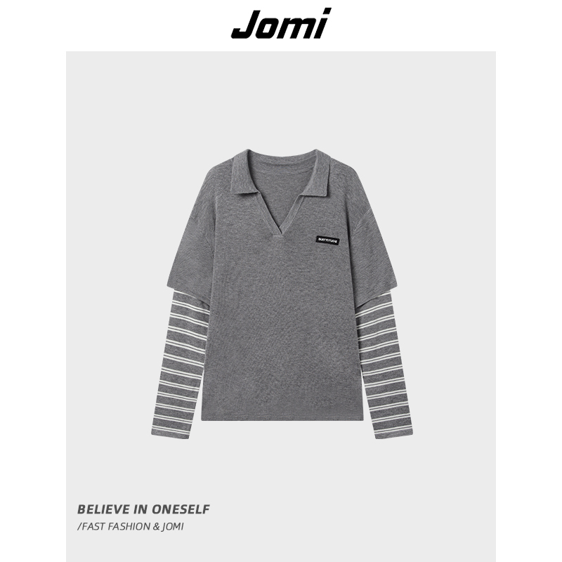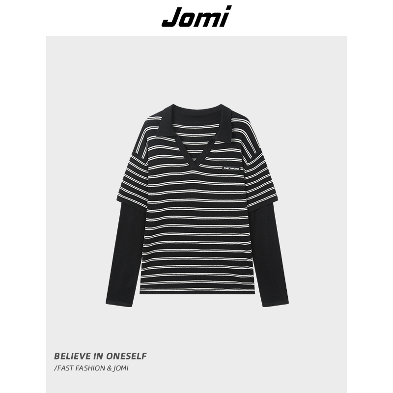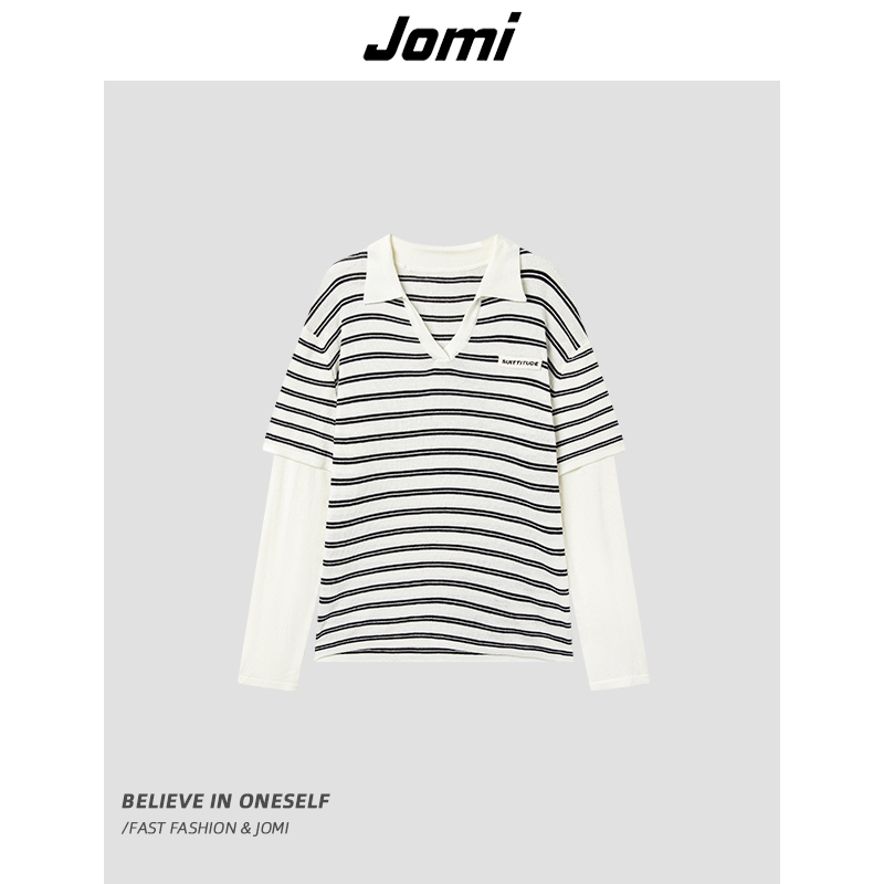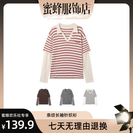 【蜜蜂欢乐社】JOMI假两件POLO领条纹针织衫女秋叠穿小众上衣