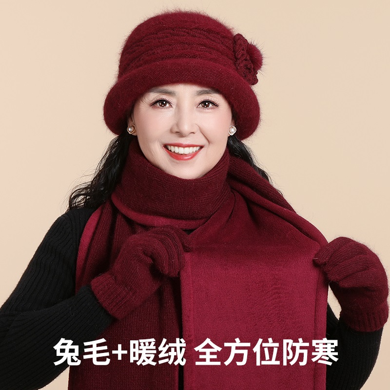 中老年人帽子女冬天妈妈毛线帽针织帽冬季老人奶奶洋气兔毛帽围巾