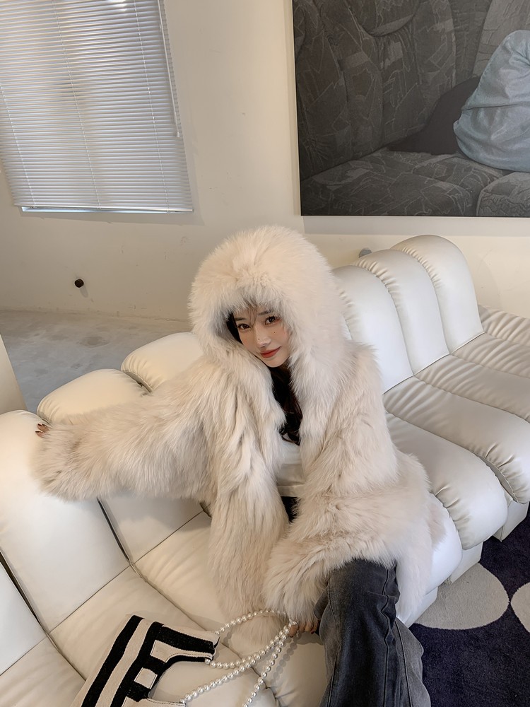 狐狸毛编织仿皮草外套女2025冬季新款短款连帽蝙蝠袖宽松毛毛大衣
