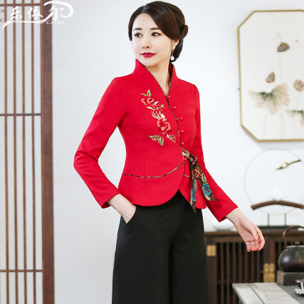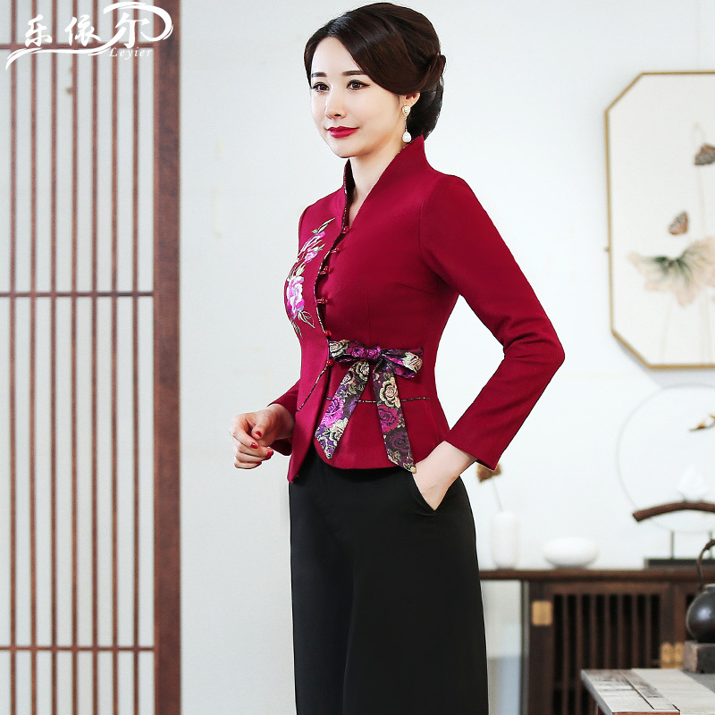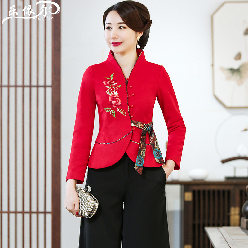 秋冬新款旗袍呢子外套改良时尚刺绣唐装上衣喜婆婆妈妈装婚宴礼服