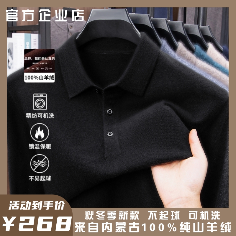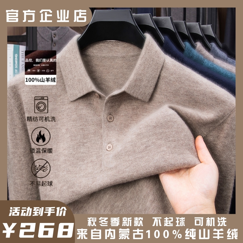 鄂尔多斯市男士100%纯羊绒衫长袖T恤翻领加厚保暖打底羊毛衫上衣