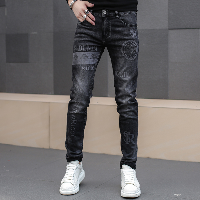 欧洲站男士春秋季新款个性潮流修身小脚弹力印花牛仔长裤子男潮牌