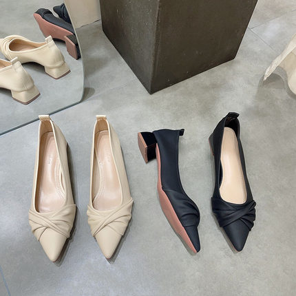 尖头浅口简约皱面单鞋女2025年春季新款法式软面粗跟瓢鞋粗跟中跟