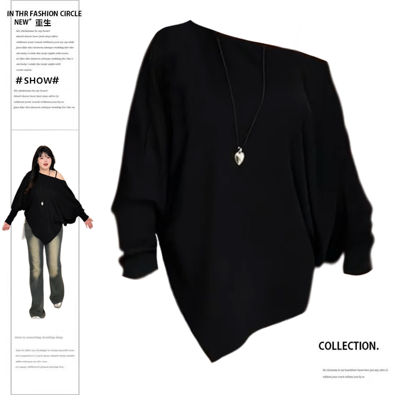 重生微胖MM黑色露肩T恤女 秋季蝙蝠袖宽松遮肉设计感上衣