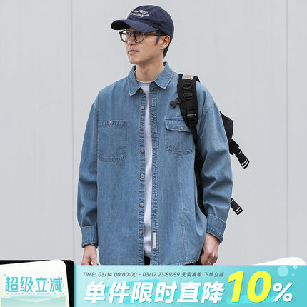嘿马七作日系复古春秋款贴袋翻领牛仔衬衫男生休闲长袖衬衣外套潮