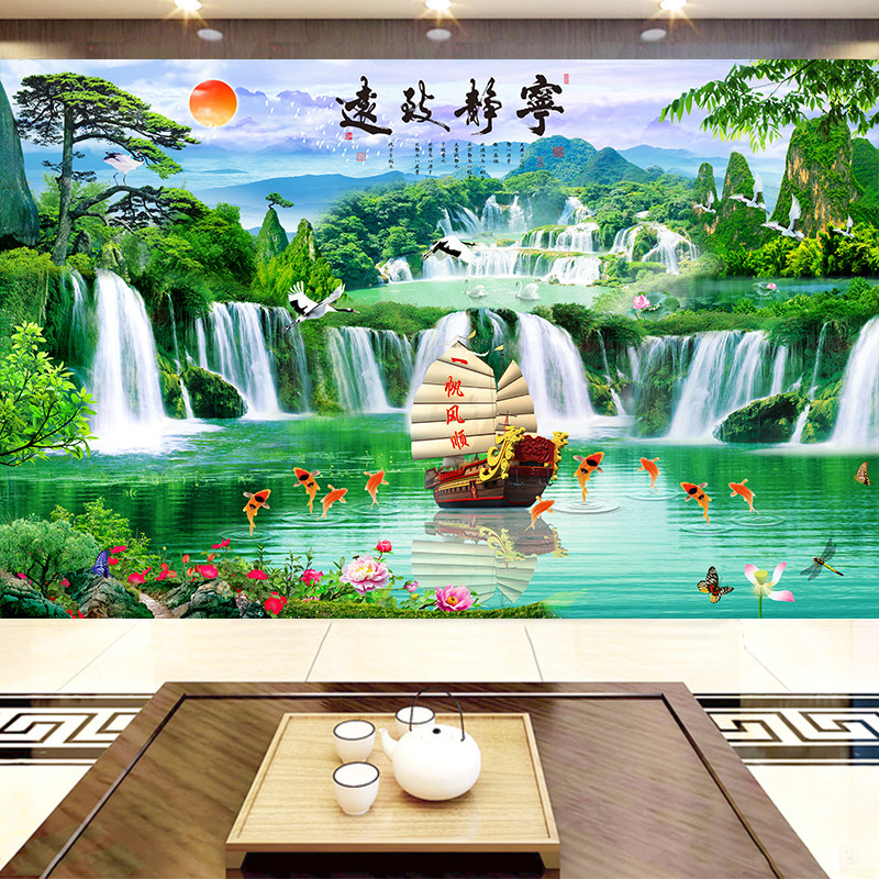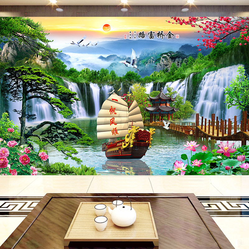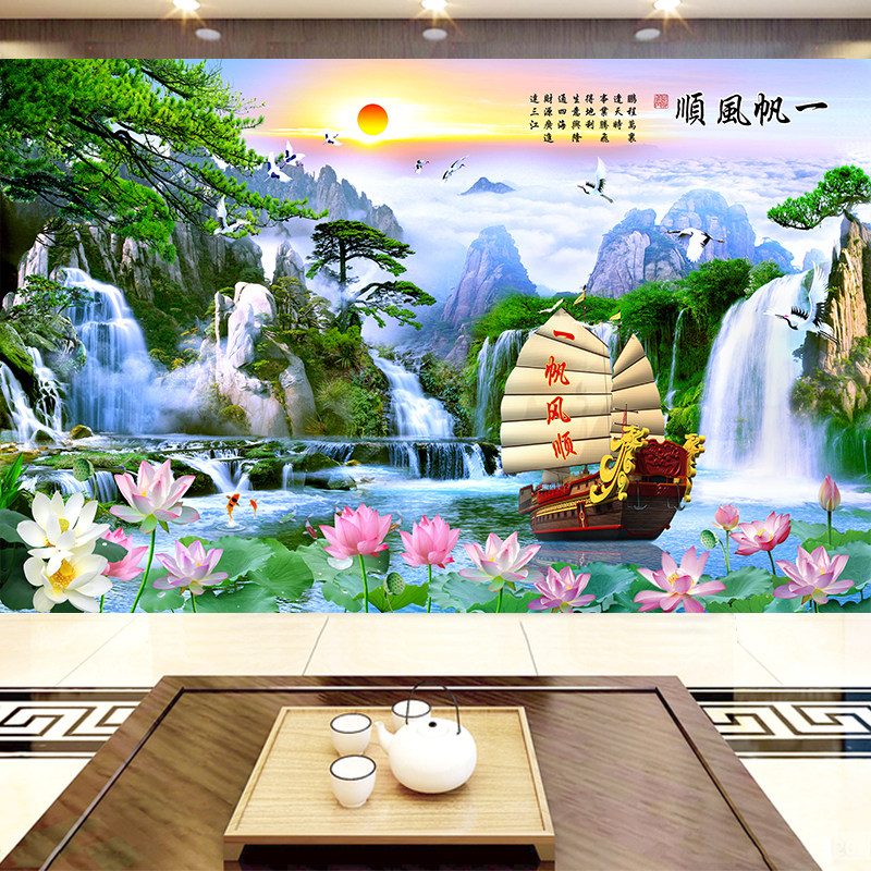 一帆风顺8d立体客厅电视背景墙5d装饰墙布3d山水风景壁画无缝壁布