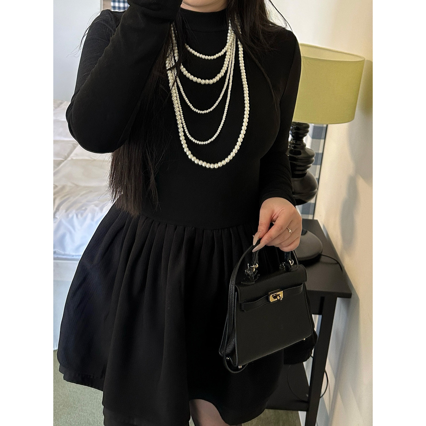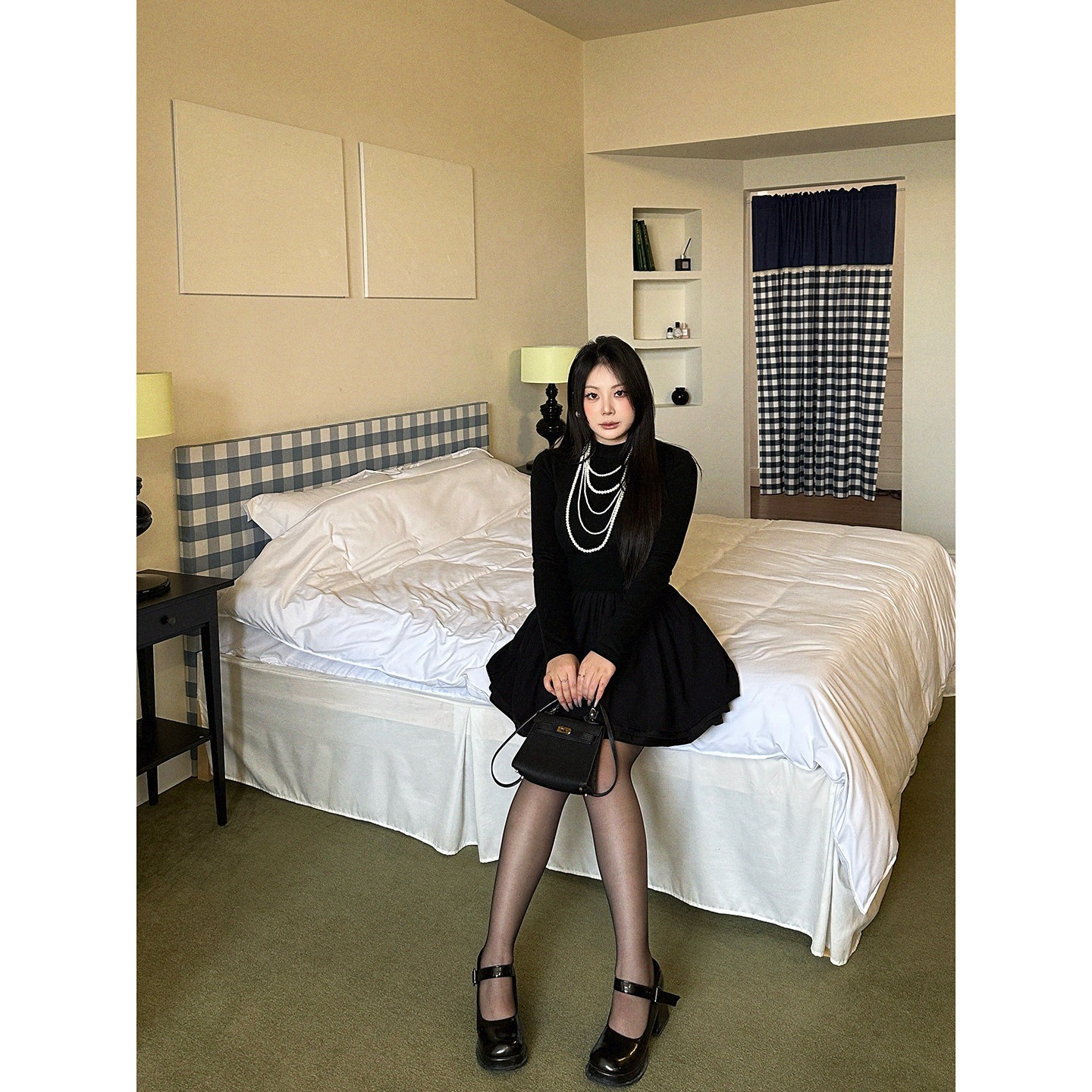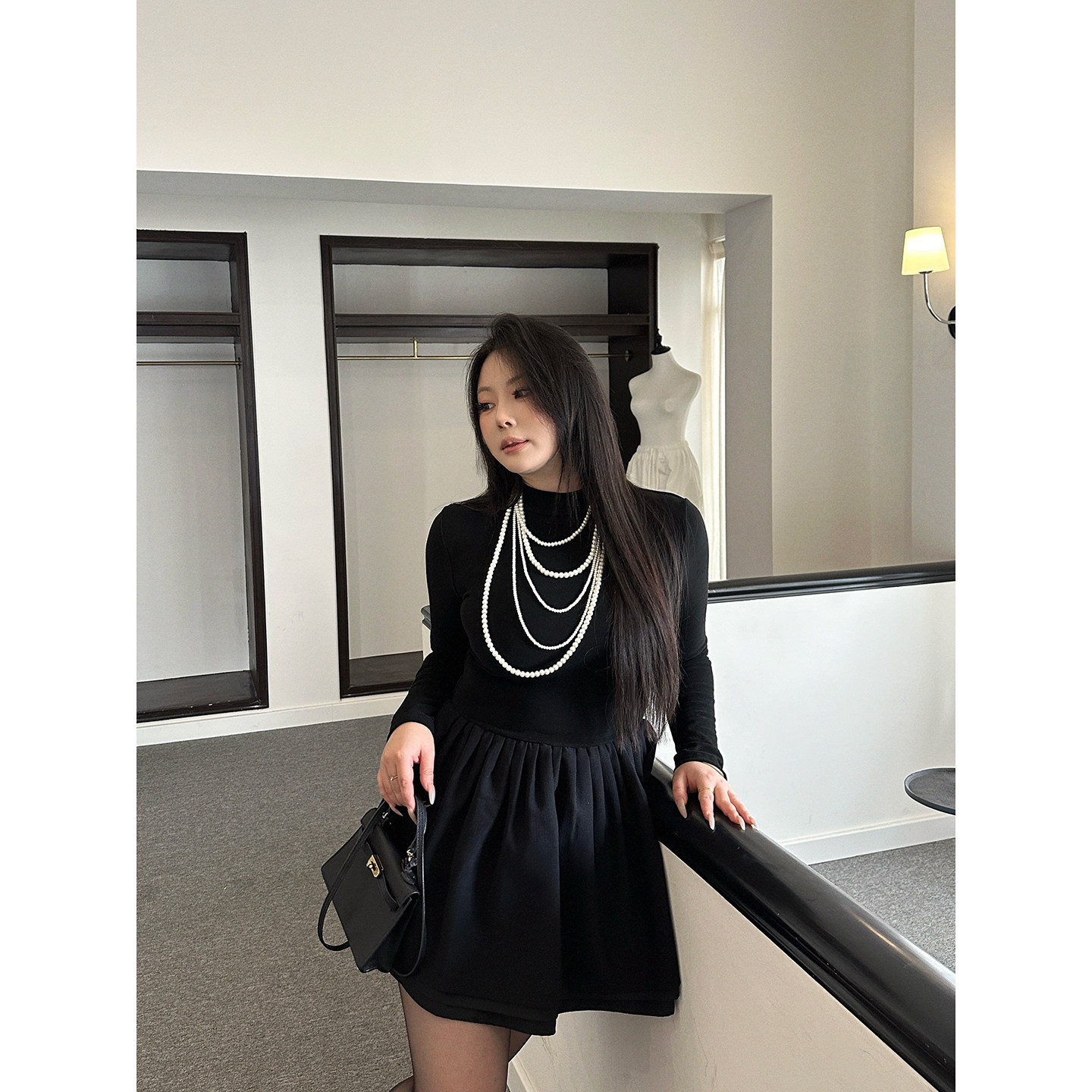 大小姐微胖大码“告白情书”半高领修身长袖收腰蓬蓬连衣裙小黑裙
