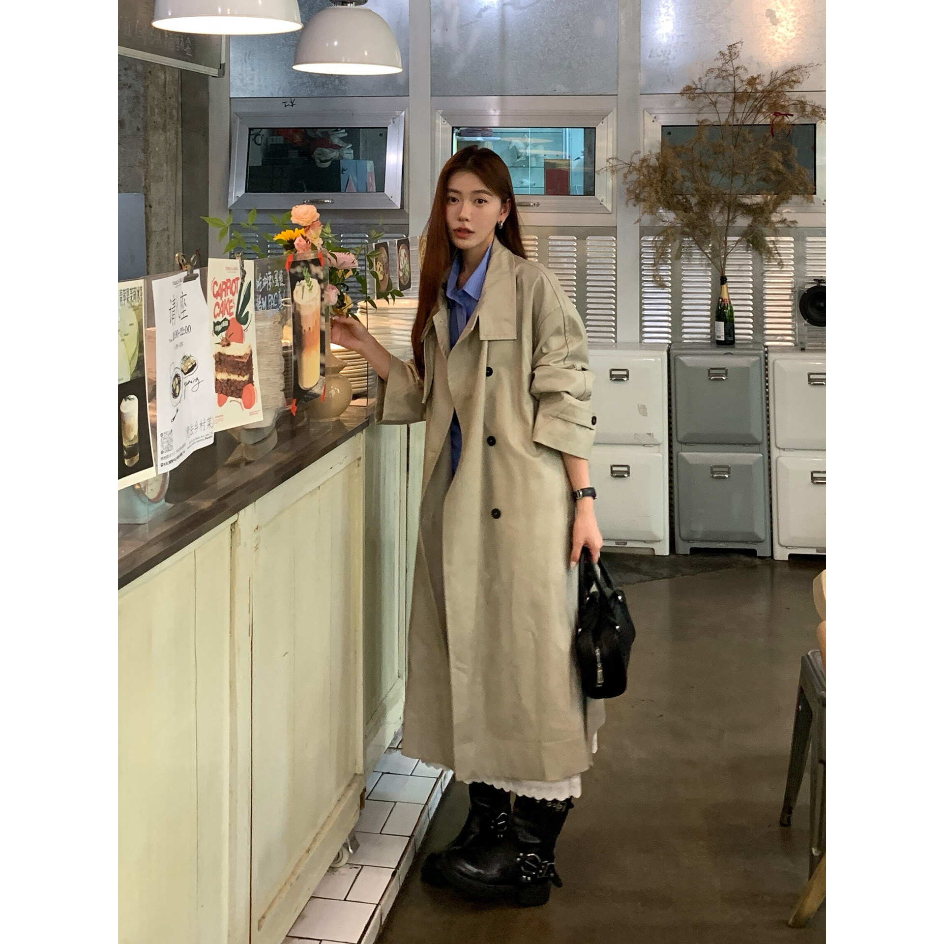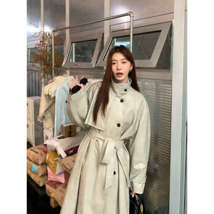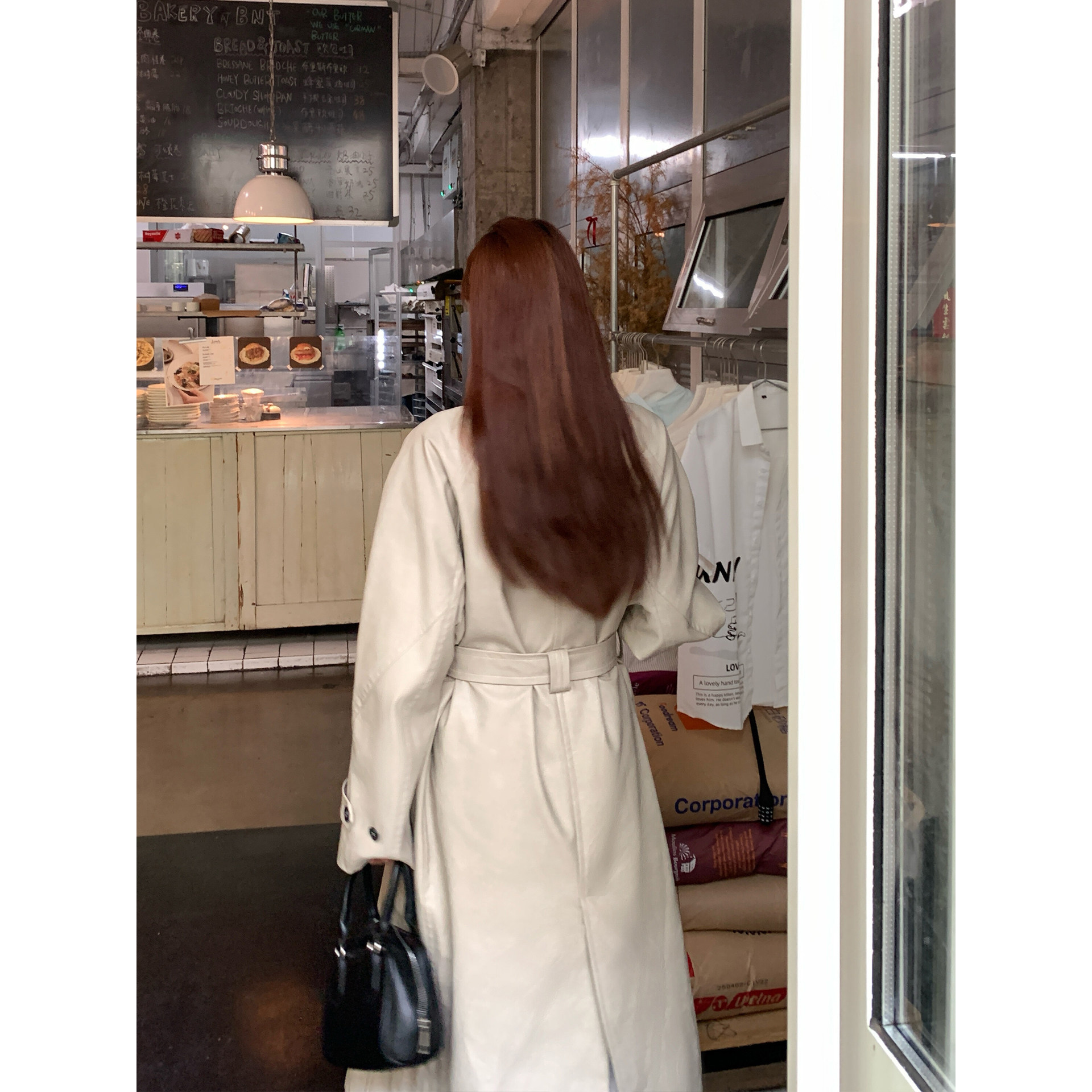 Halo Luu灰白色皮风衣外套女秋季韩系油蜡皮气质高级感中长款大衣