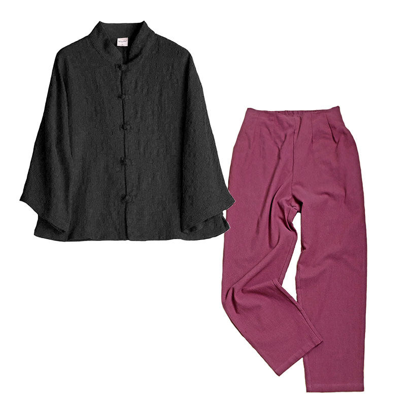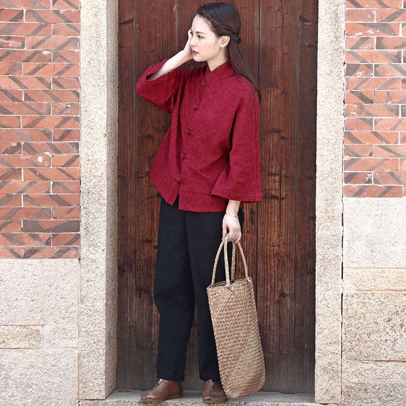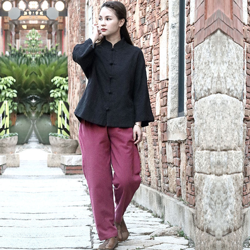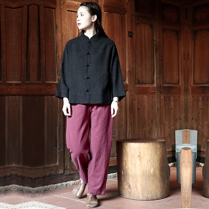 苇素不易皱棉麻盘扣衬衫+烟管裤