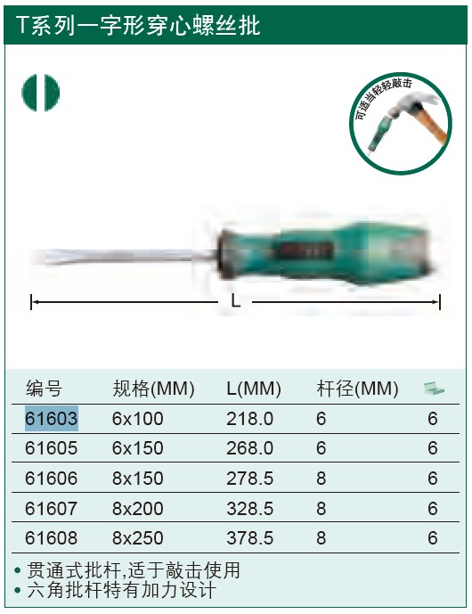 世达工具T系列一字形穿心螺丝批 61603 61605 61607 61608 61606