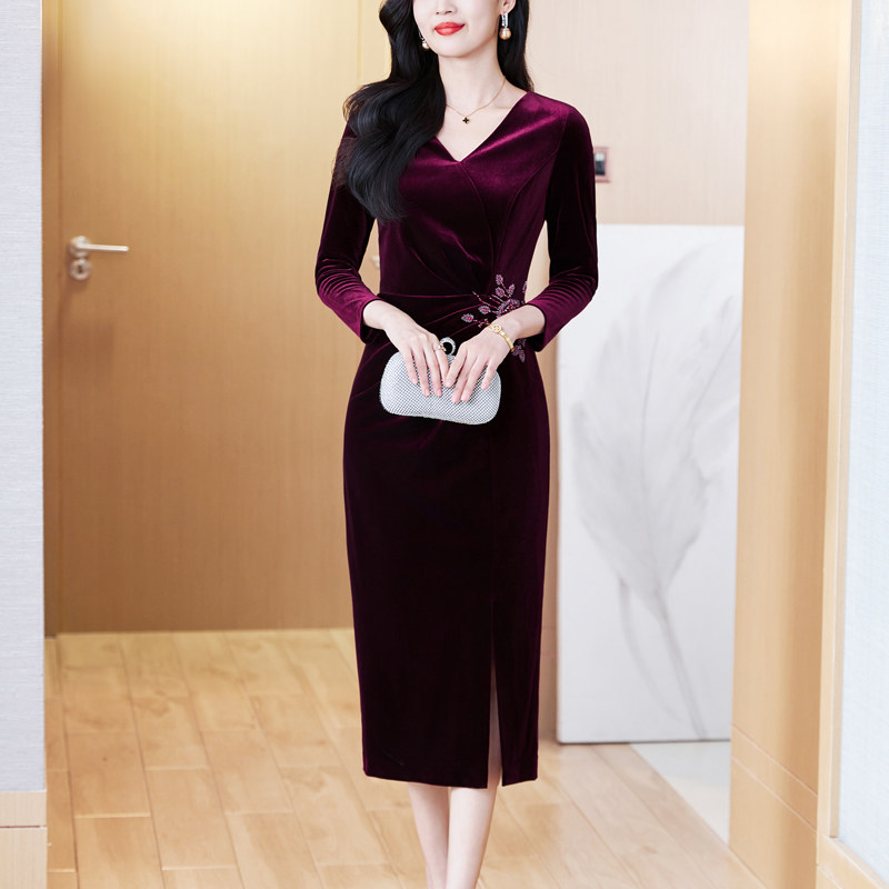 酒红金丝绒晚礼服连衣裙女2025秋冬新款V领中长款收腰新娘敬酒服