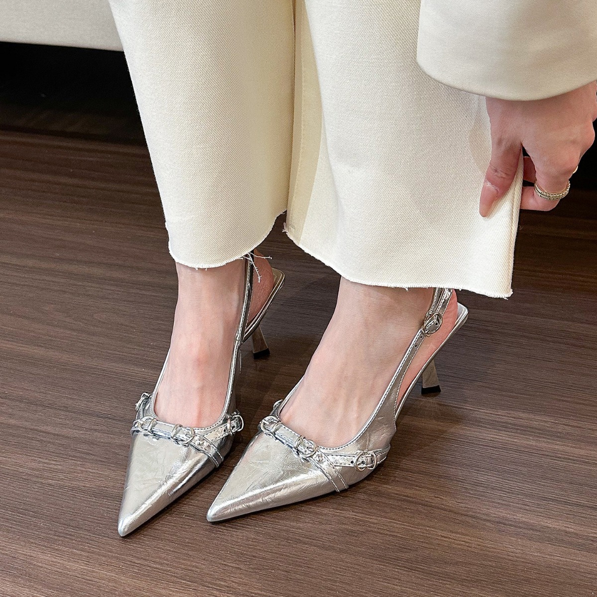 银色尖头凉鞋女后空2025年春夏包头浅口细跟高跟鞋子