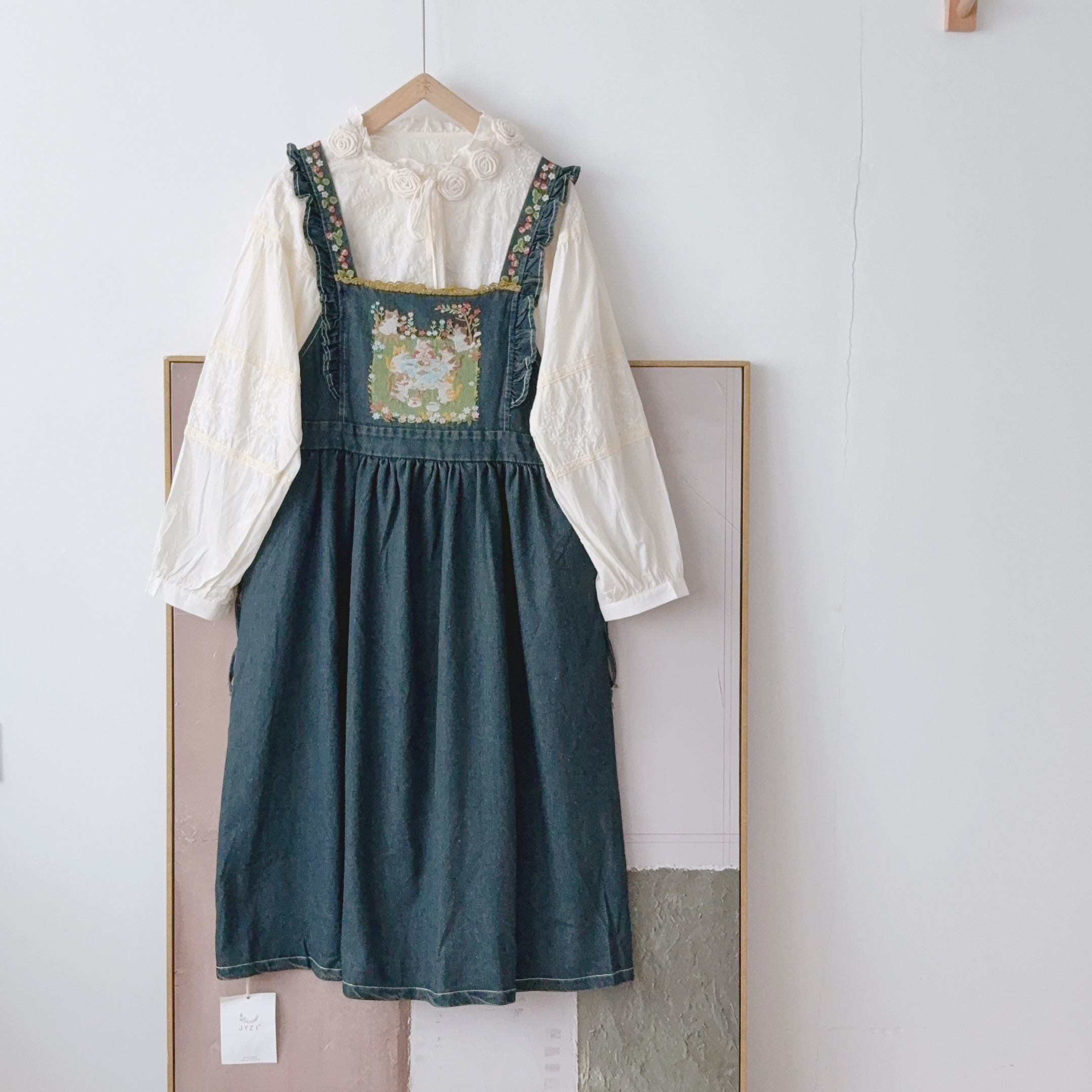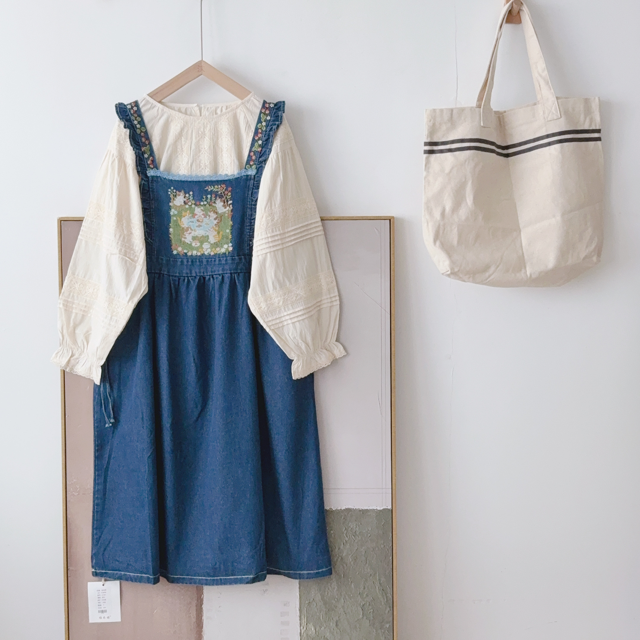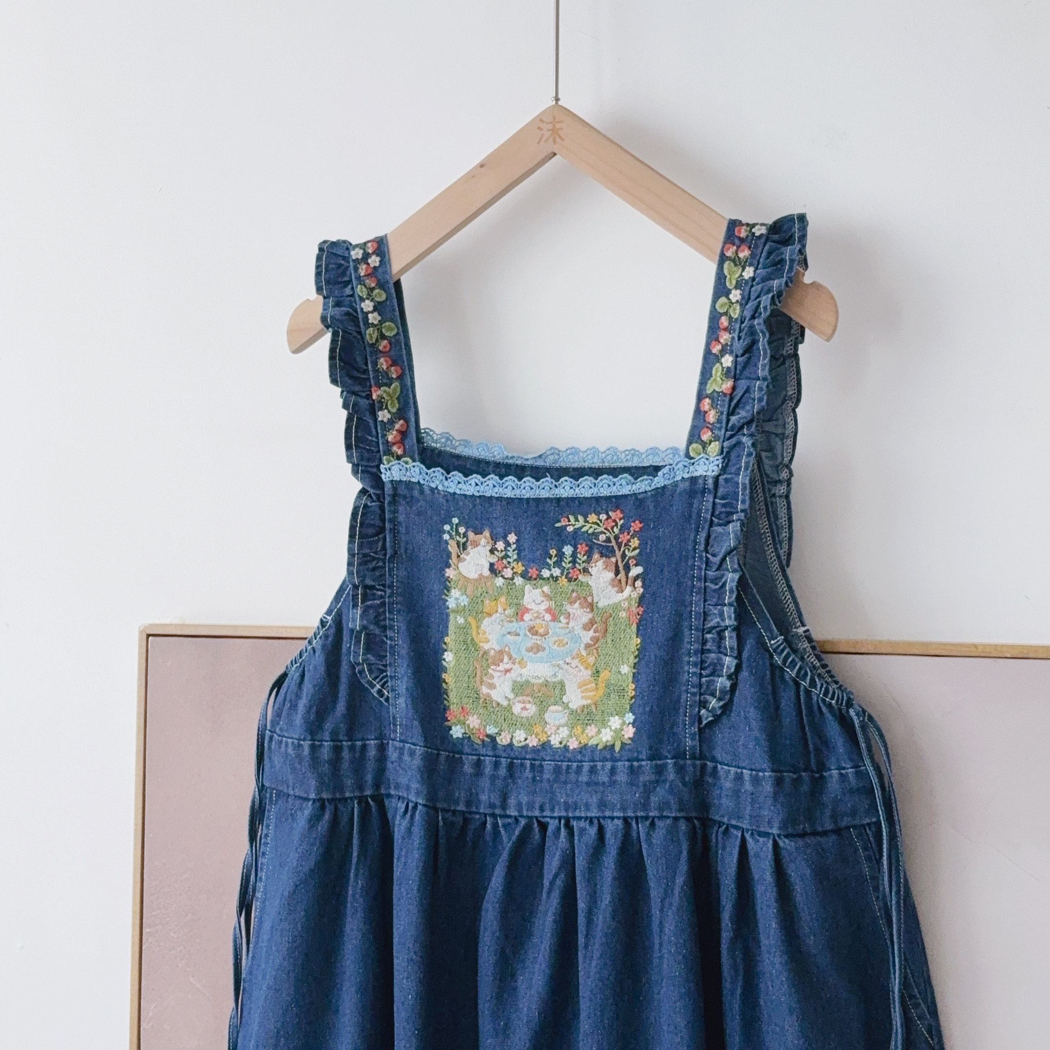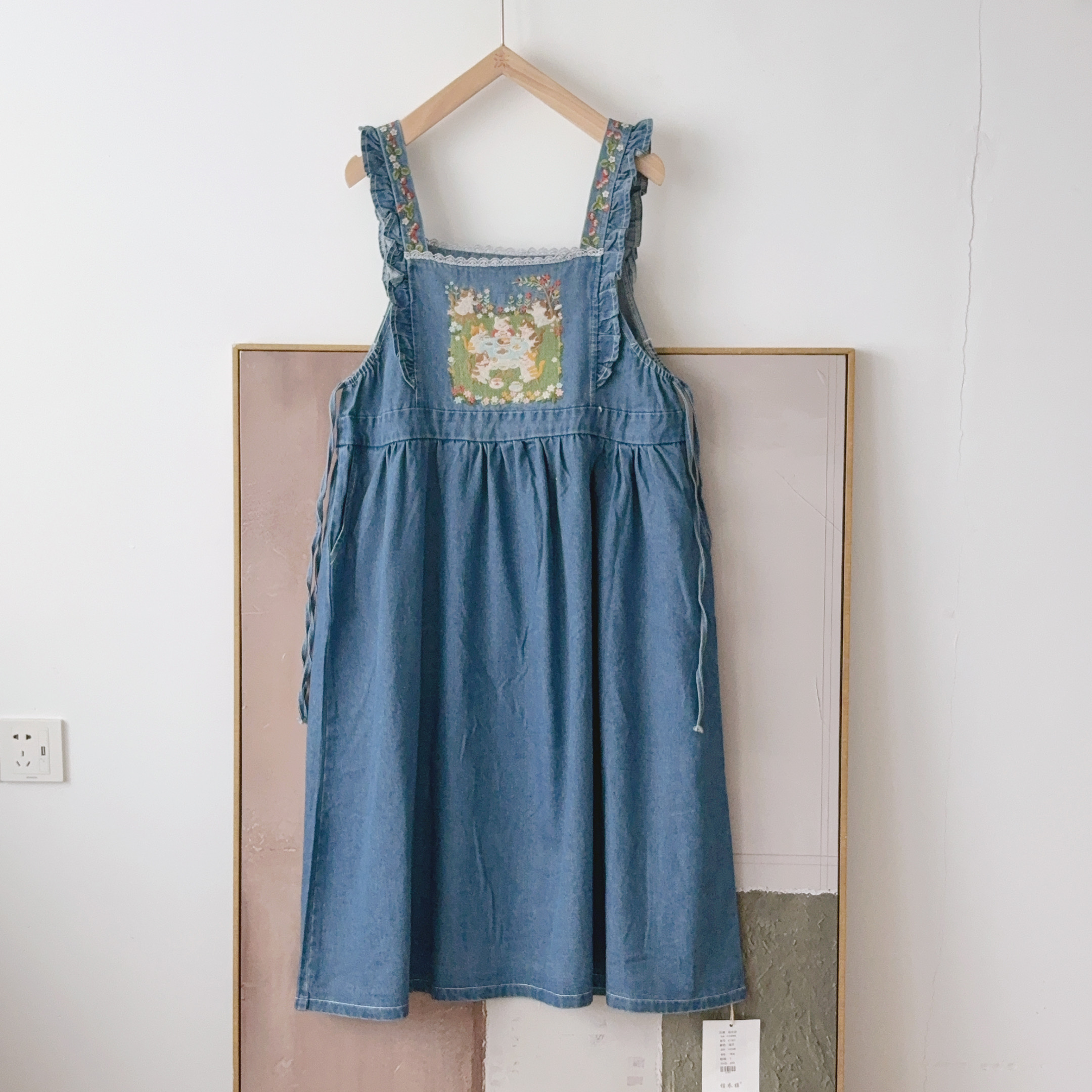 牛仔背带裙 森日系木耳边刺绣小猫抽绳宽松小众百搭裙子JYZ61301