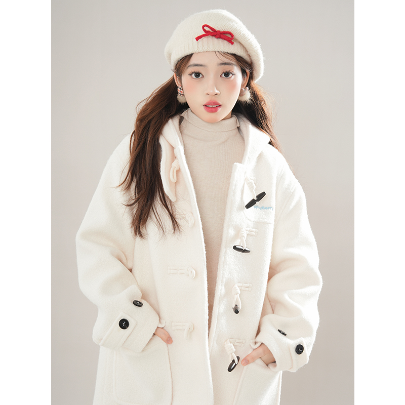 奶白色秋冬牛角扣大衣学院风毛呢外套中长款2025秋冬新款呢子外套