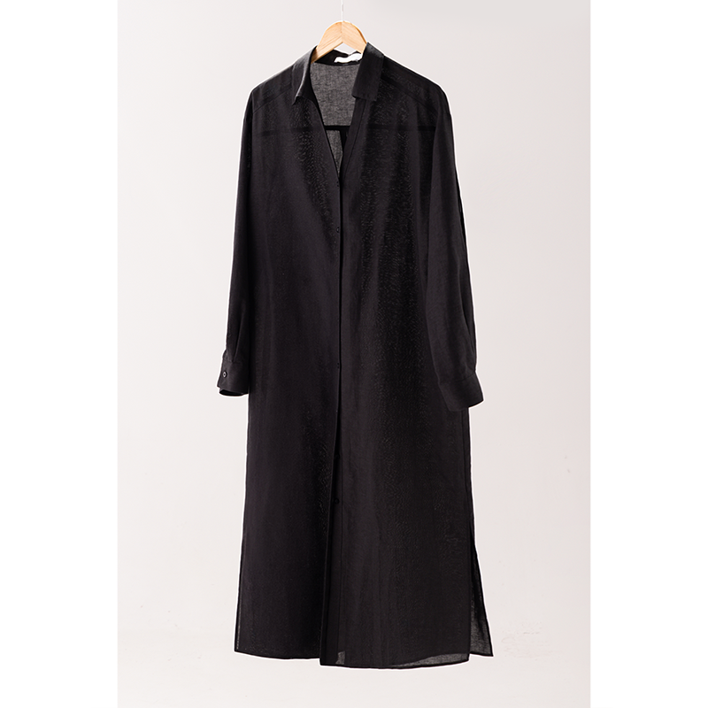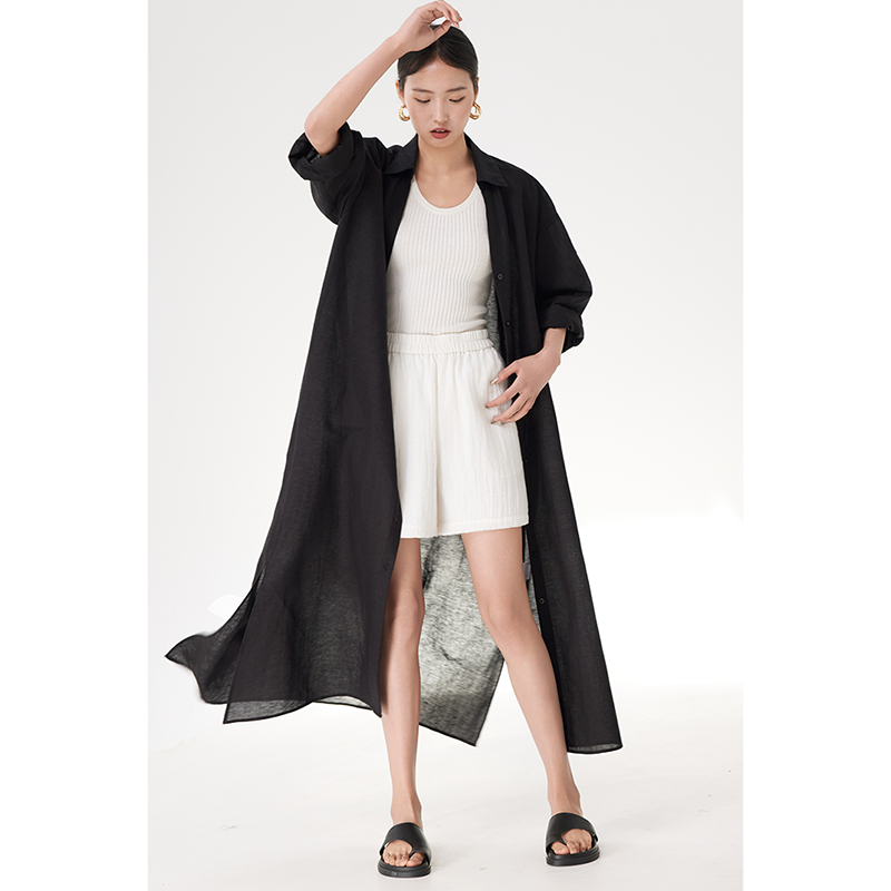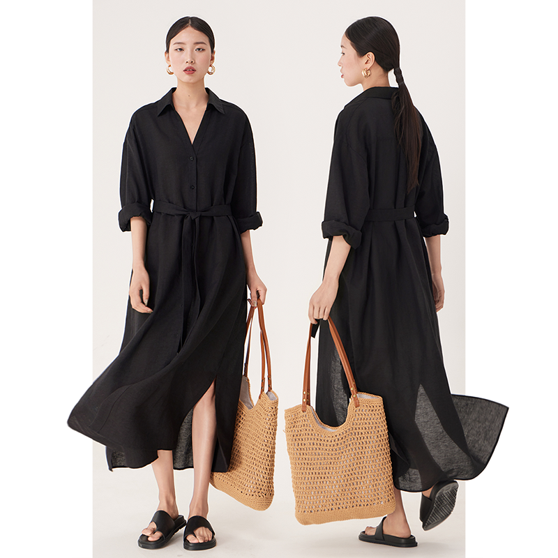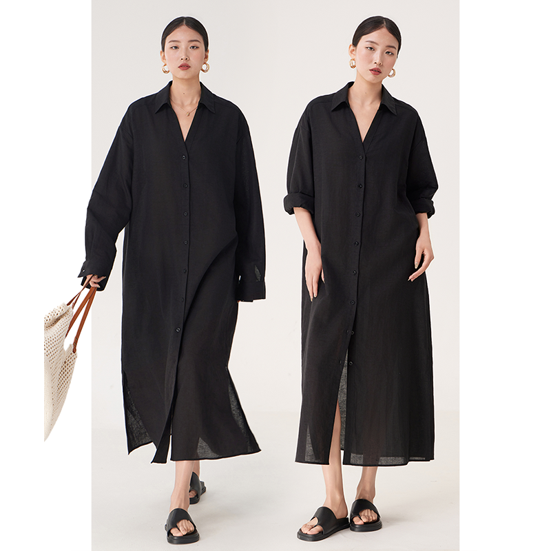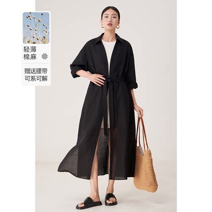天然亚麻棉麻连衣裙防晒衫开叉宽松老钱风舒适慵懒透气简约黑色女