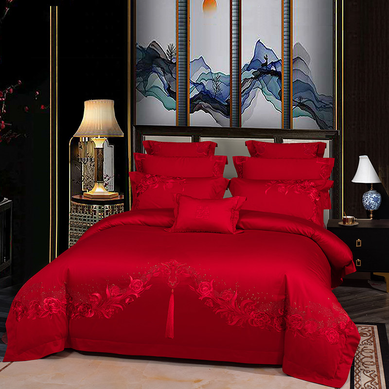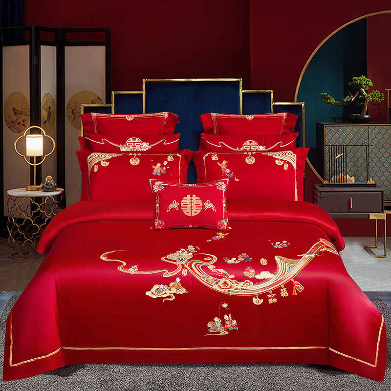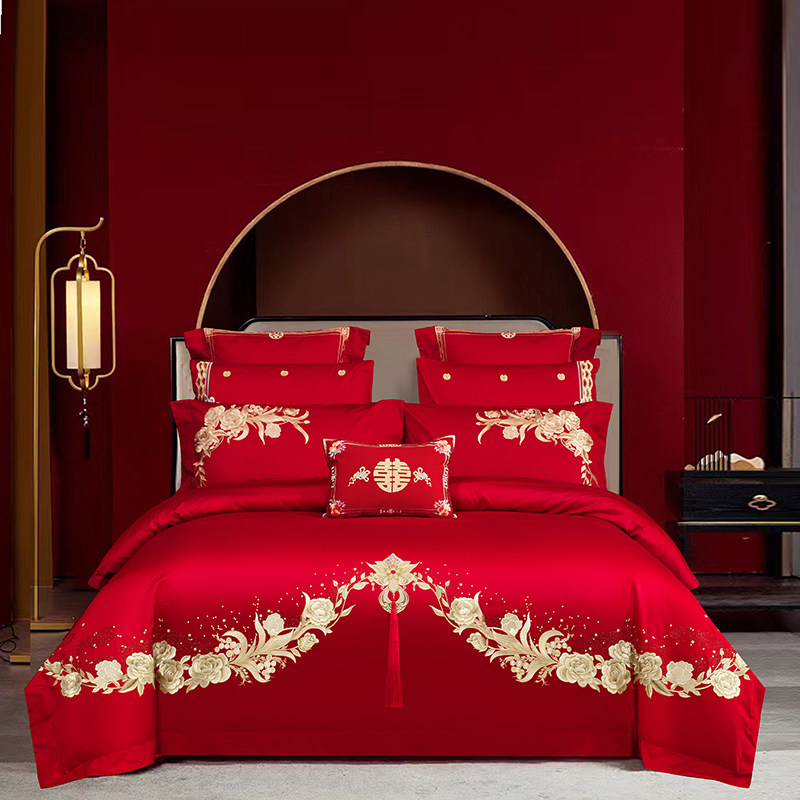 新婚庆牀上全棉四件套纯棉大红色绣花传统结婚被罩牀单式喜庆牀品