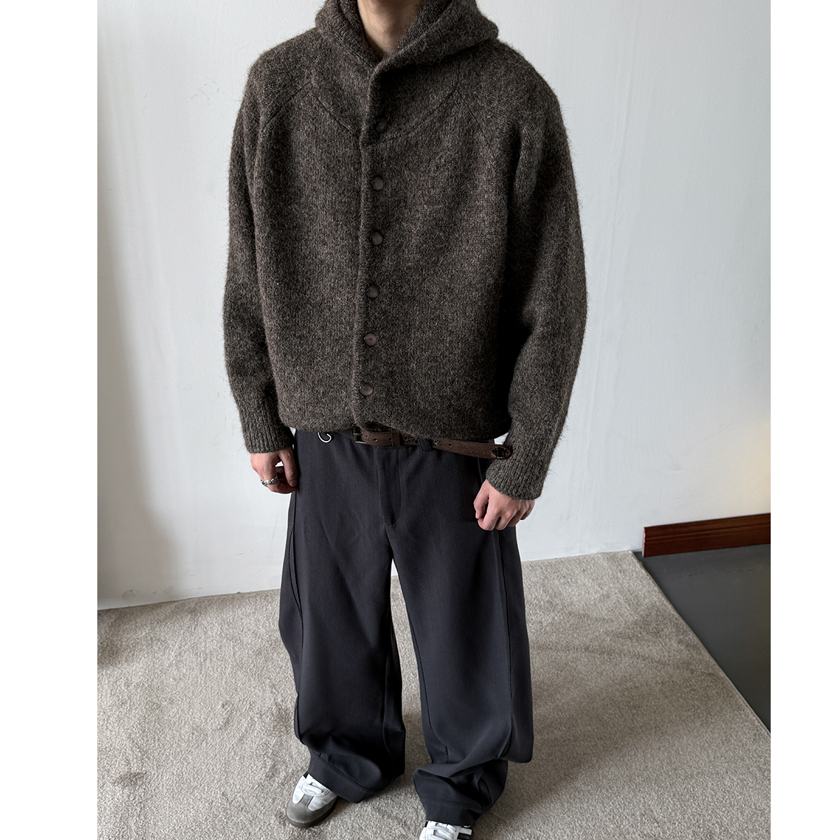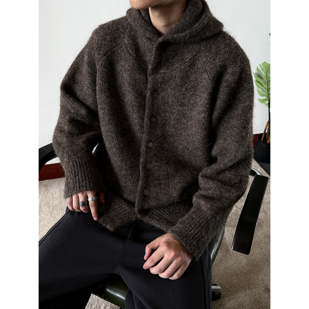 MANCHER 925G羊毛混纺连帽纽扣毛衣男女慵懒松弛感短款针织外套潮