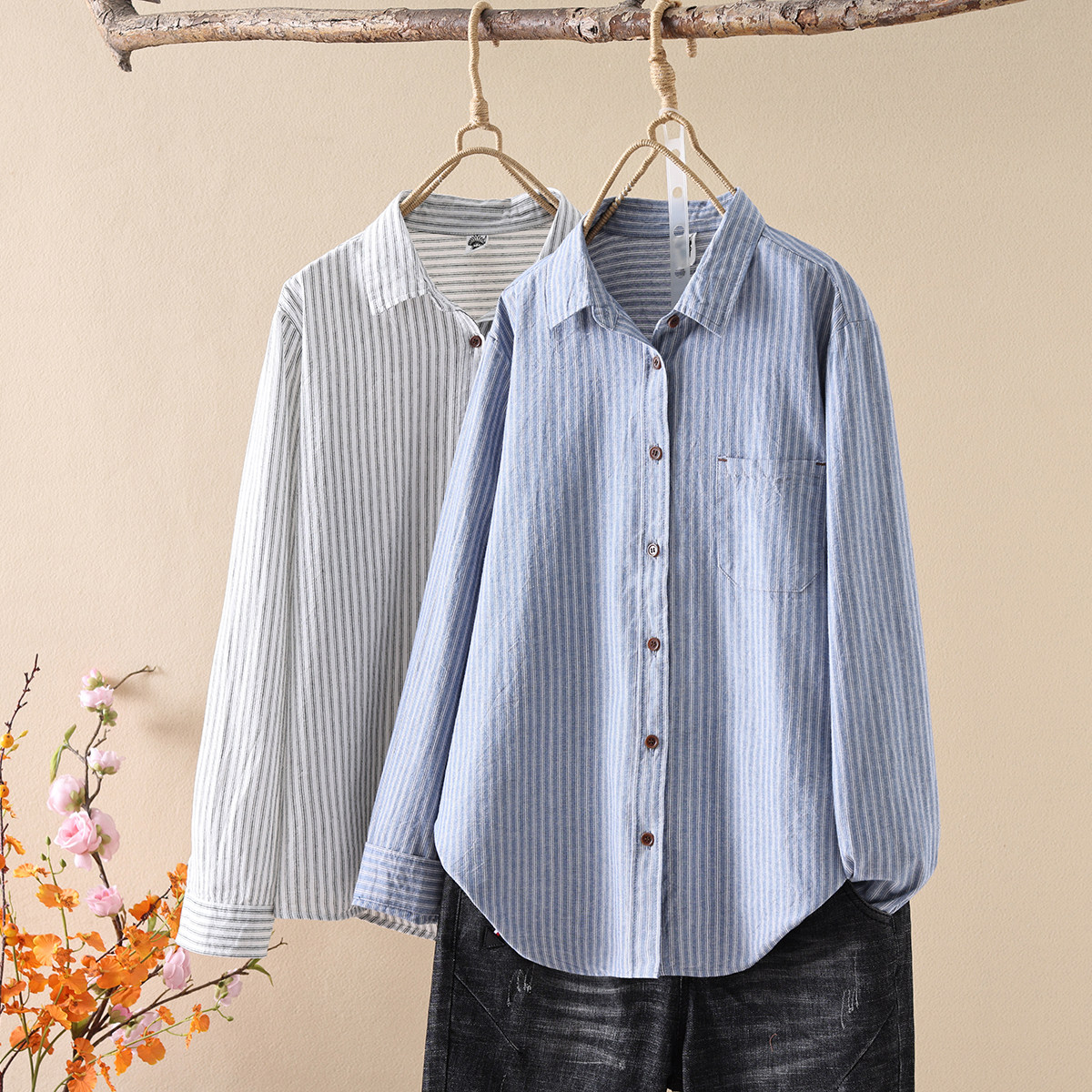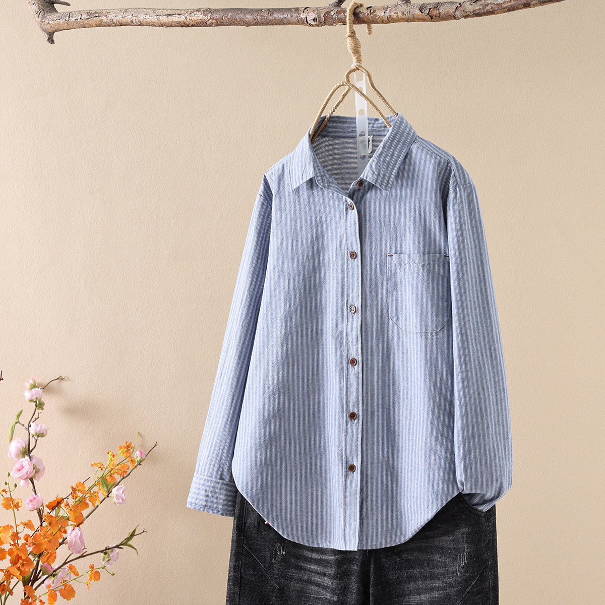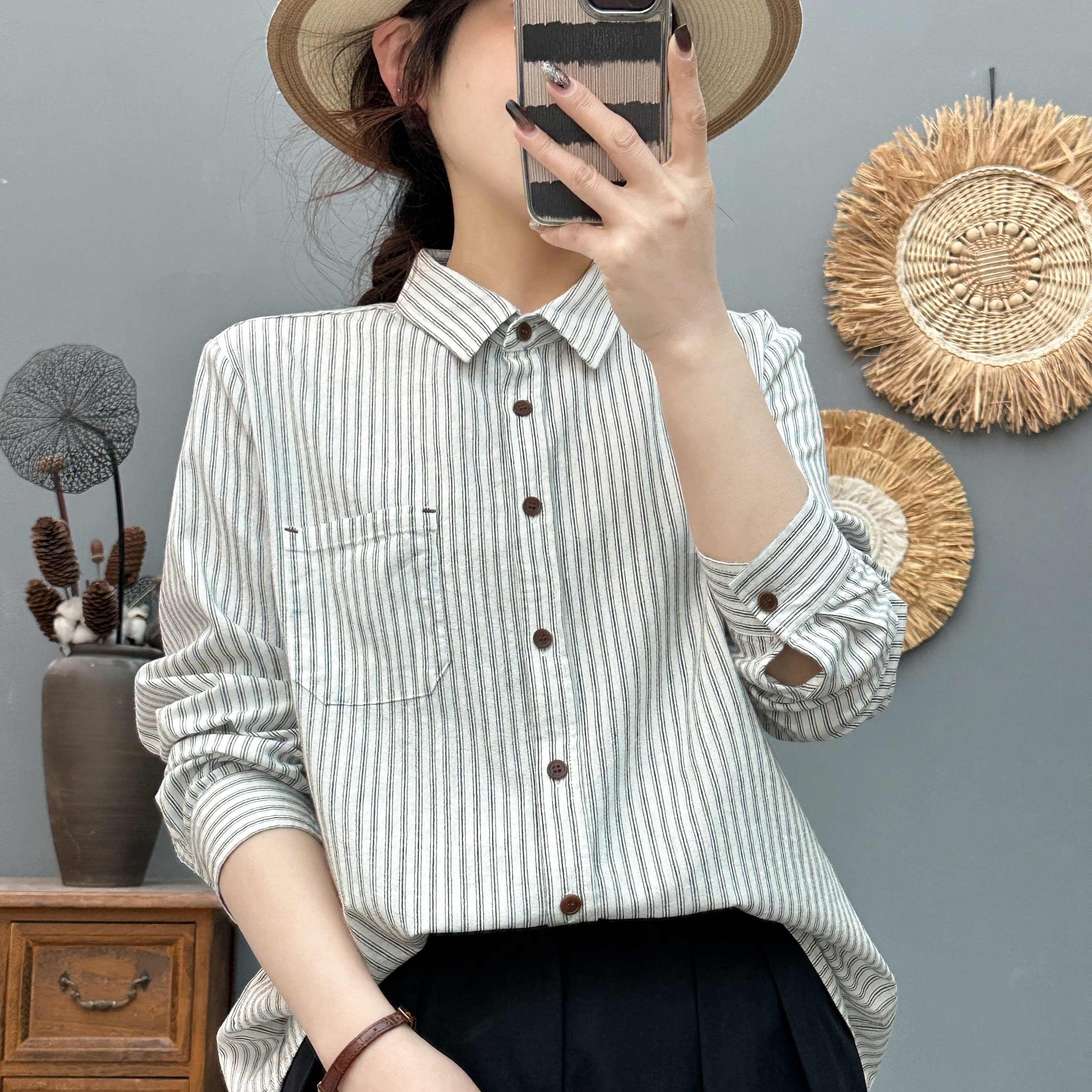 欧货纯棉水洗提花条纹衬衫女早春长袖宽松显瘦百搭打底衫上衣
