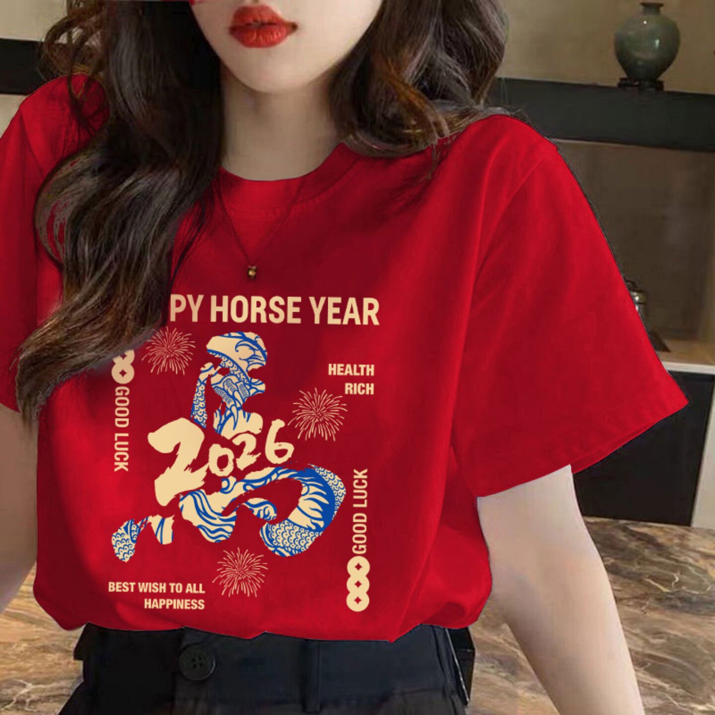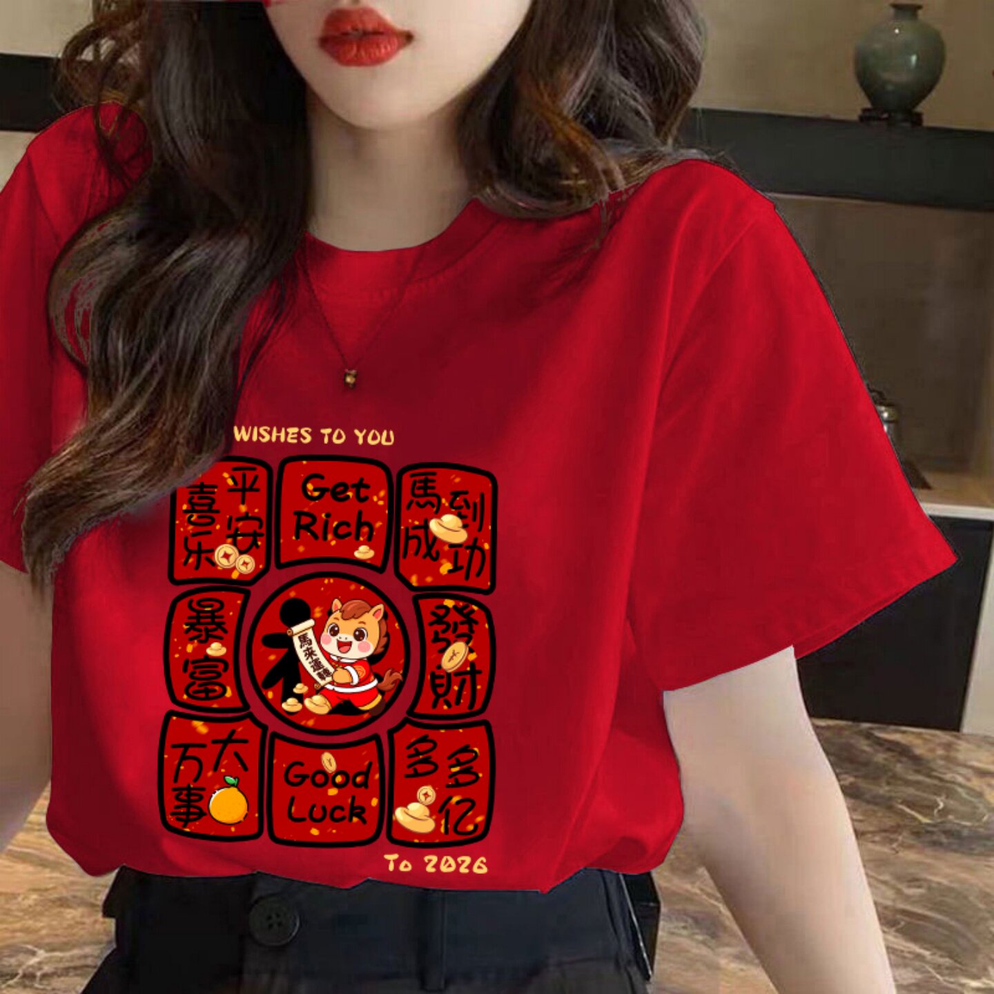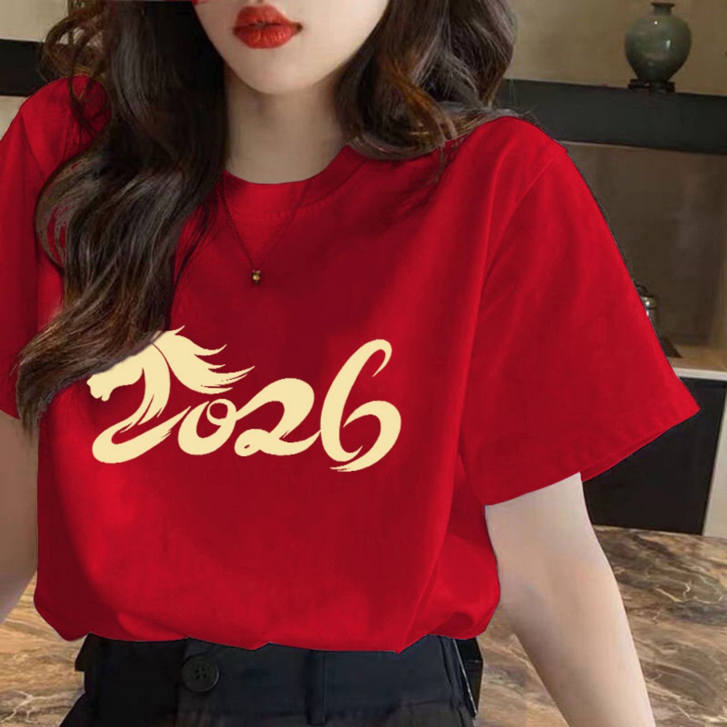 红色马年本命年衣服纯棉新年t恤女短袖2026新款宽松百搭过年上衣