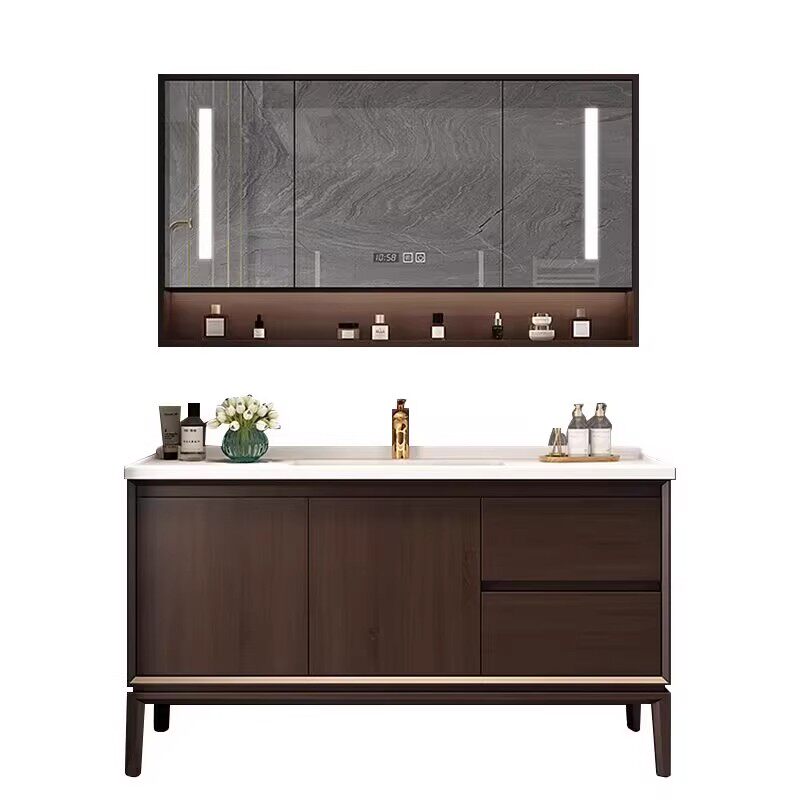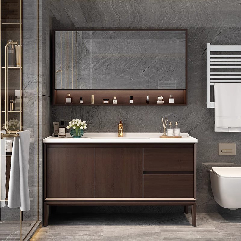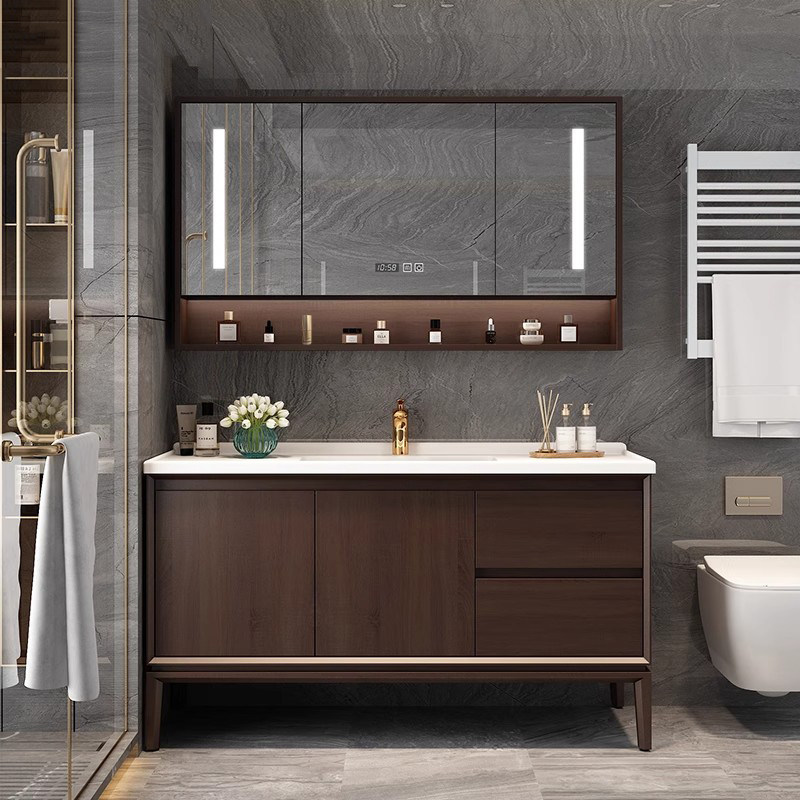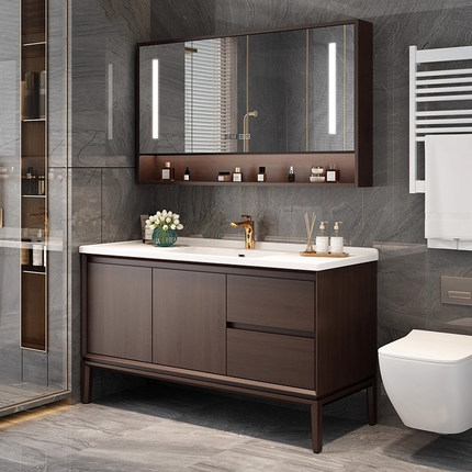 新中式浴室柜橡木智能镜柜一体陶瓷盆实木卫浴柜落地洗脸盆柜组合