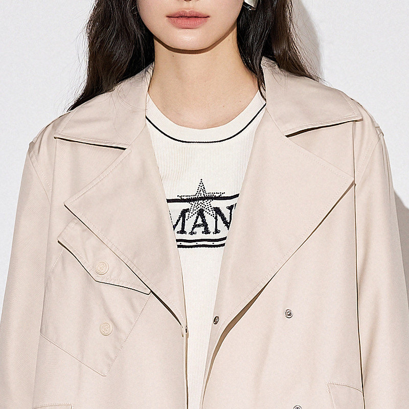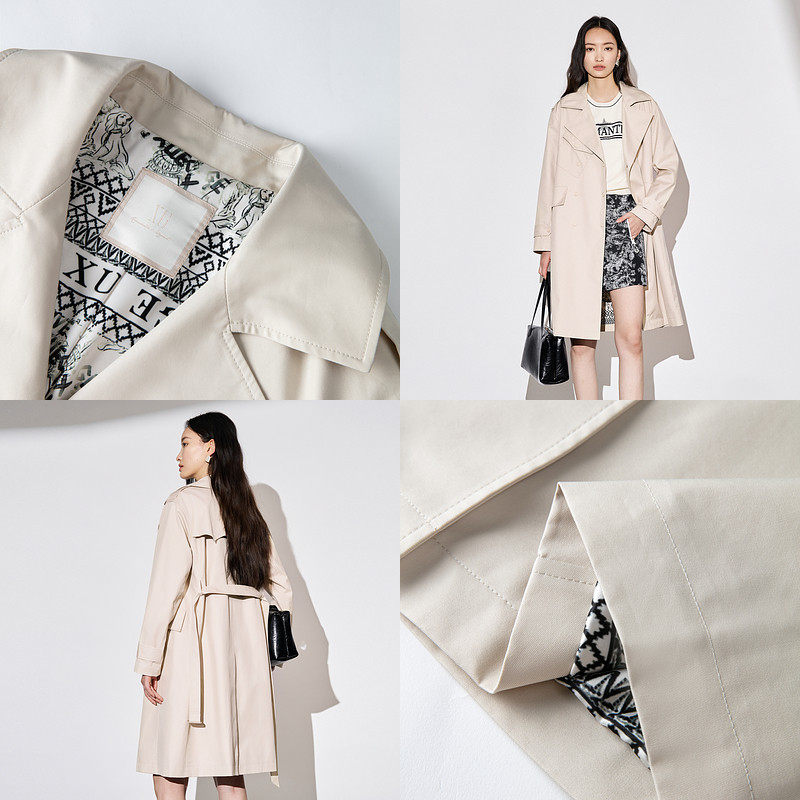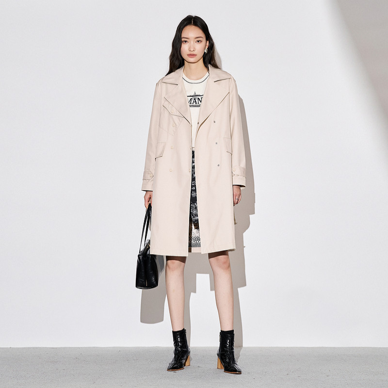 XG雪歌浅米色中长款休闲风衣时尚秋季新款翻驳领设计长袖外套女装