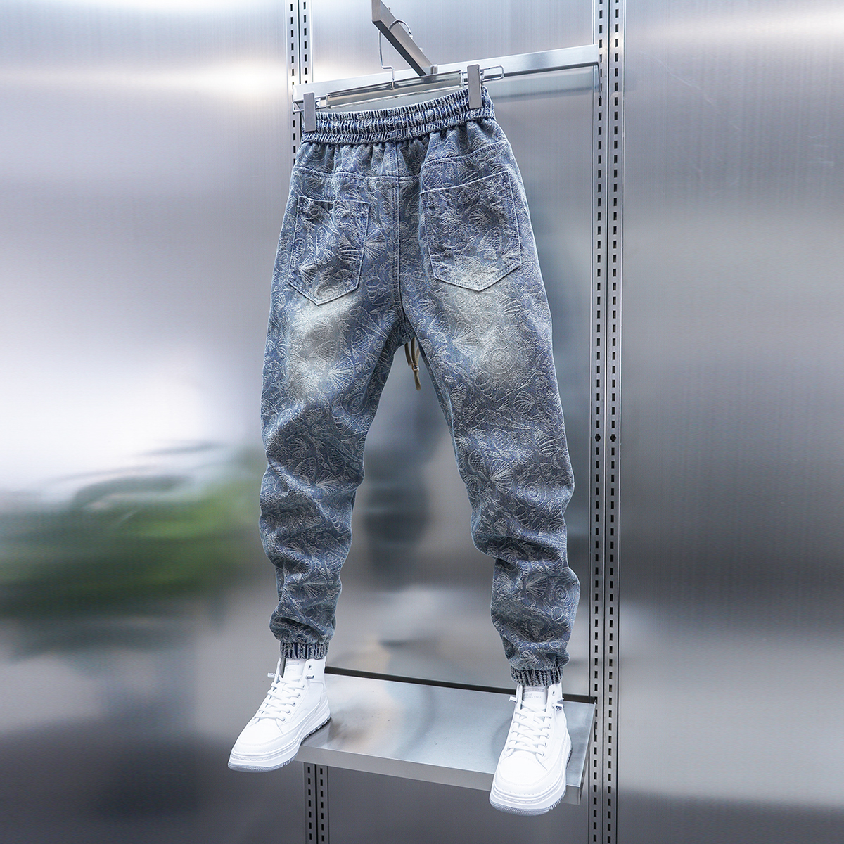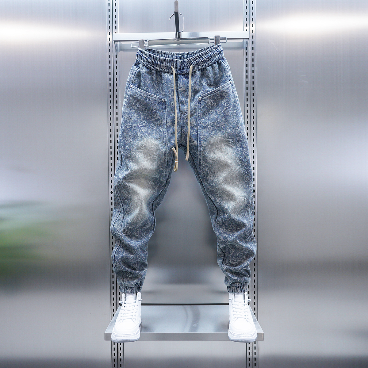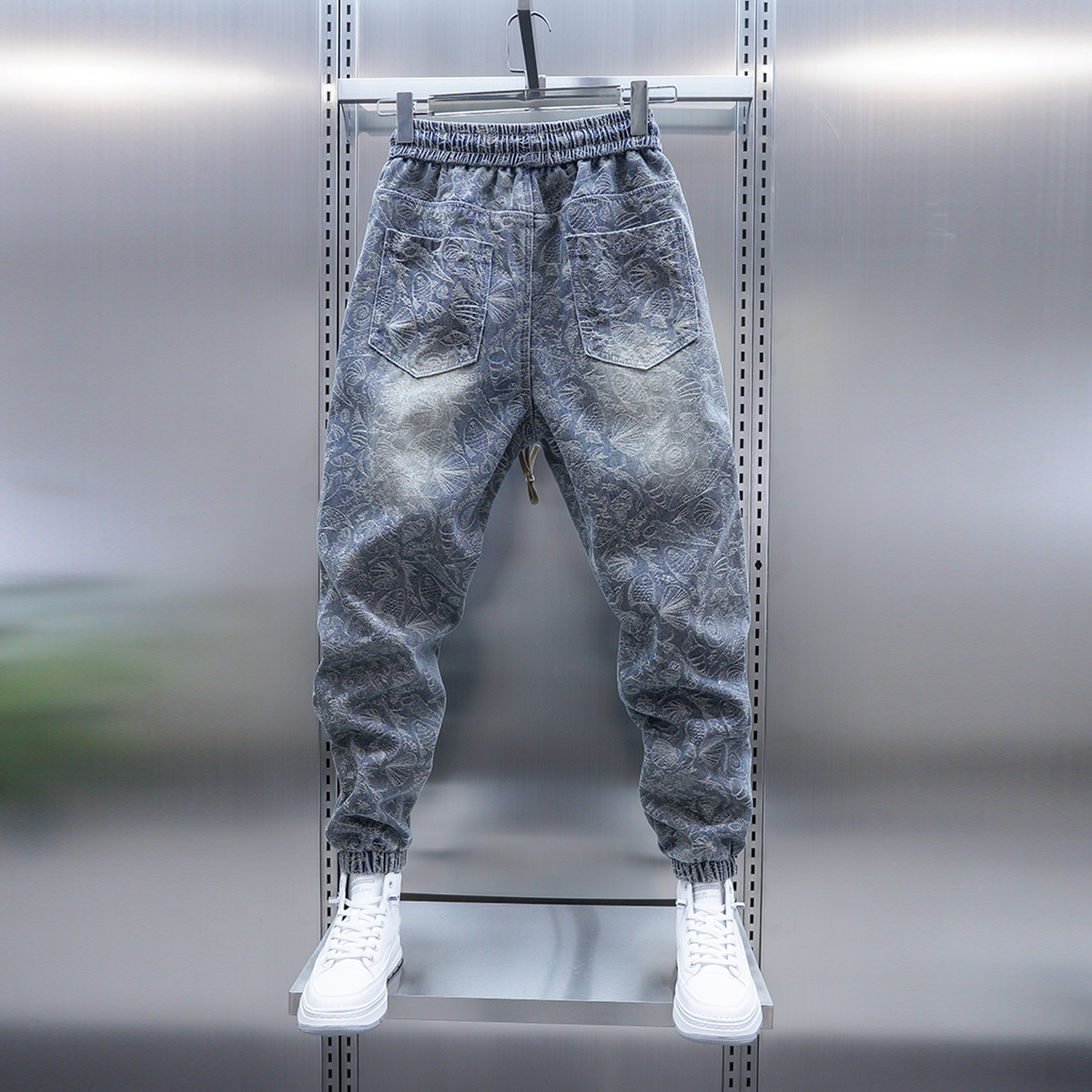 潮流男士春秋牛仔裤浅蓝色提花工艺束脚裤潮牌时尚青年小脚裤