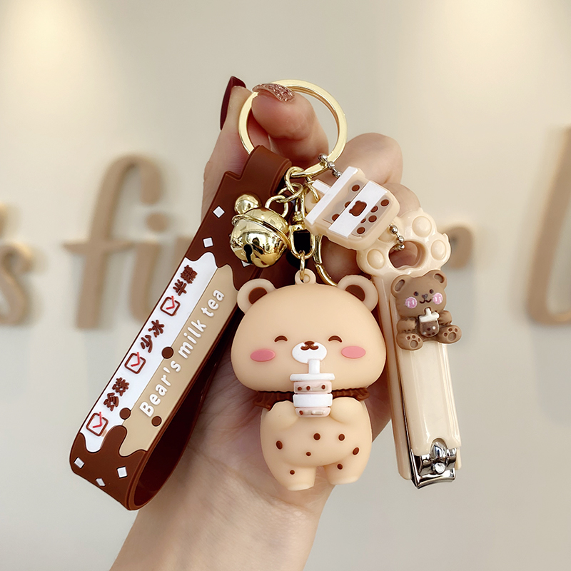 少女心创意水晶奶茶杯皮绳钥匙链圈卡通毛球包包挂件汽车钥匙扣女