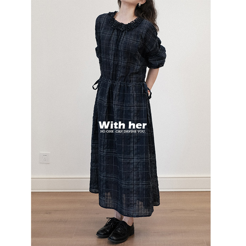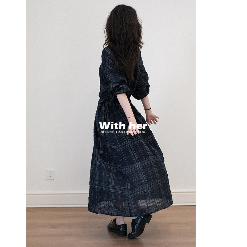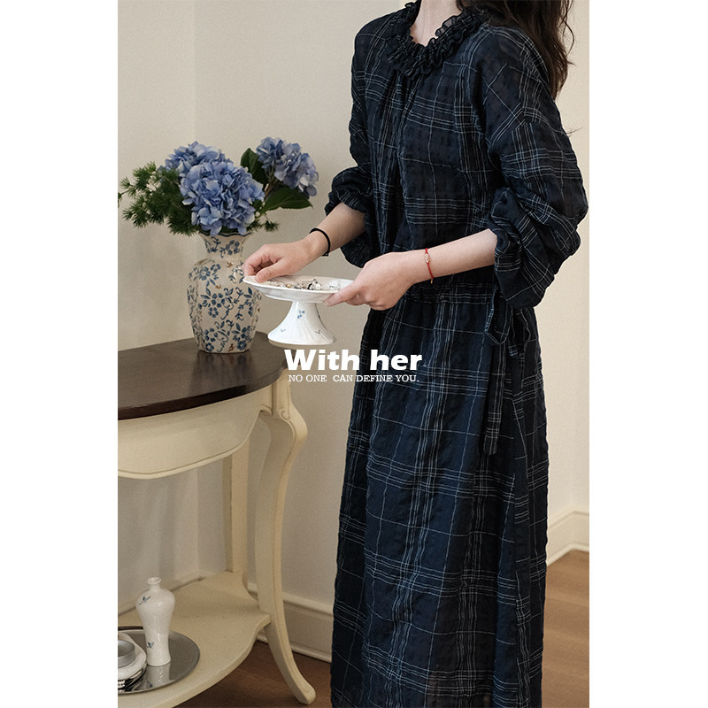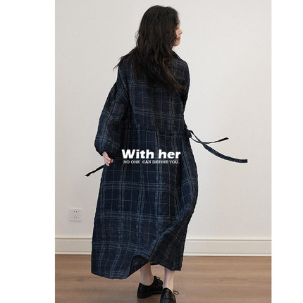 与她原创小众设计日系慵懒复古宽松休闲花边格纹衬衫连衣裙中长裙