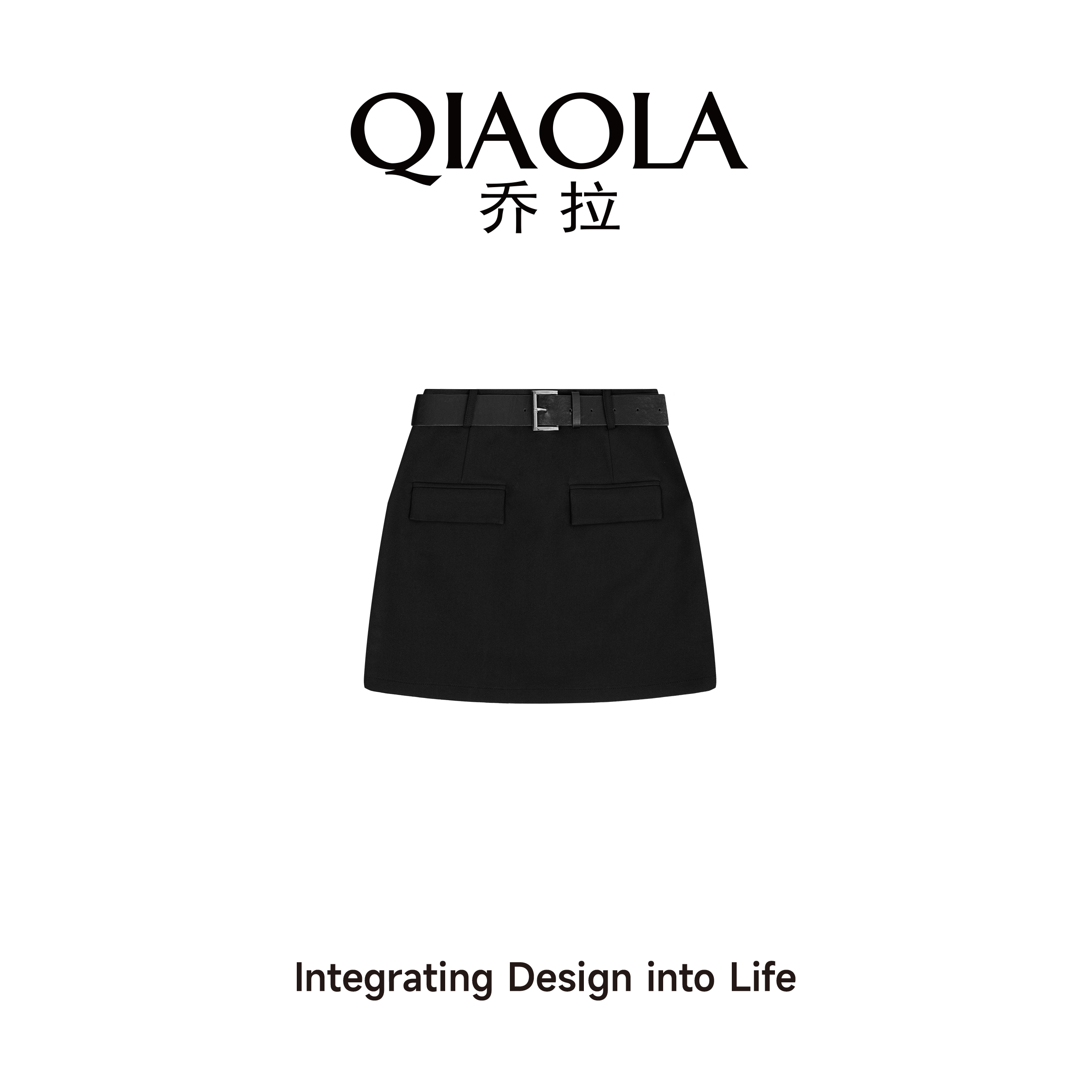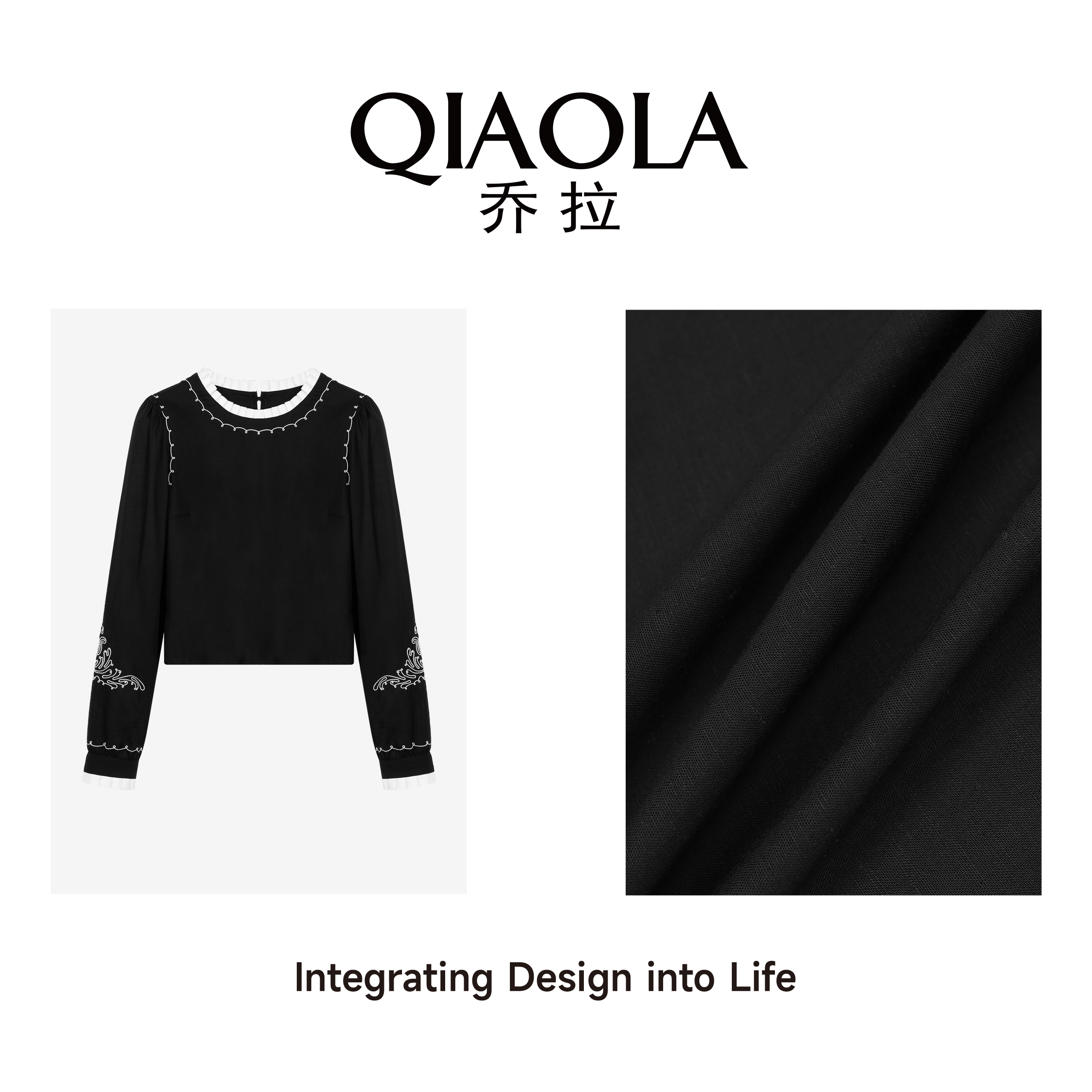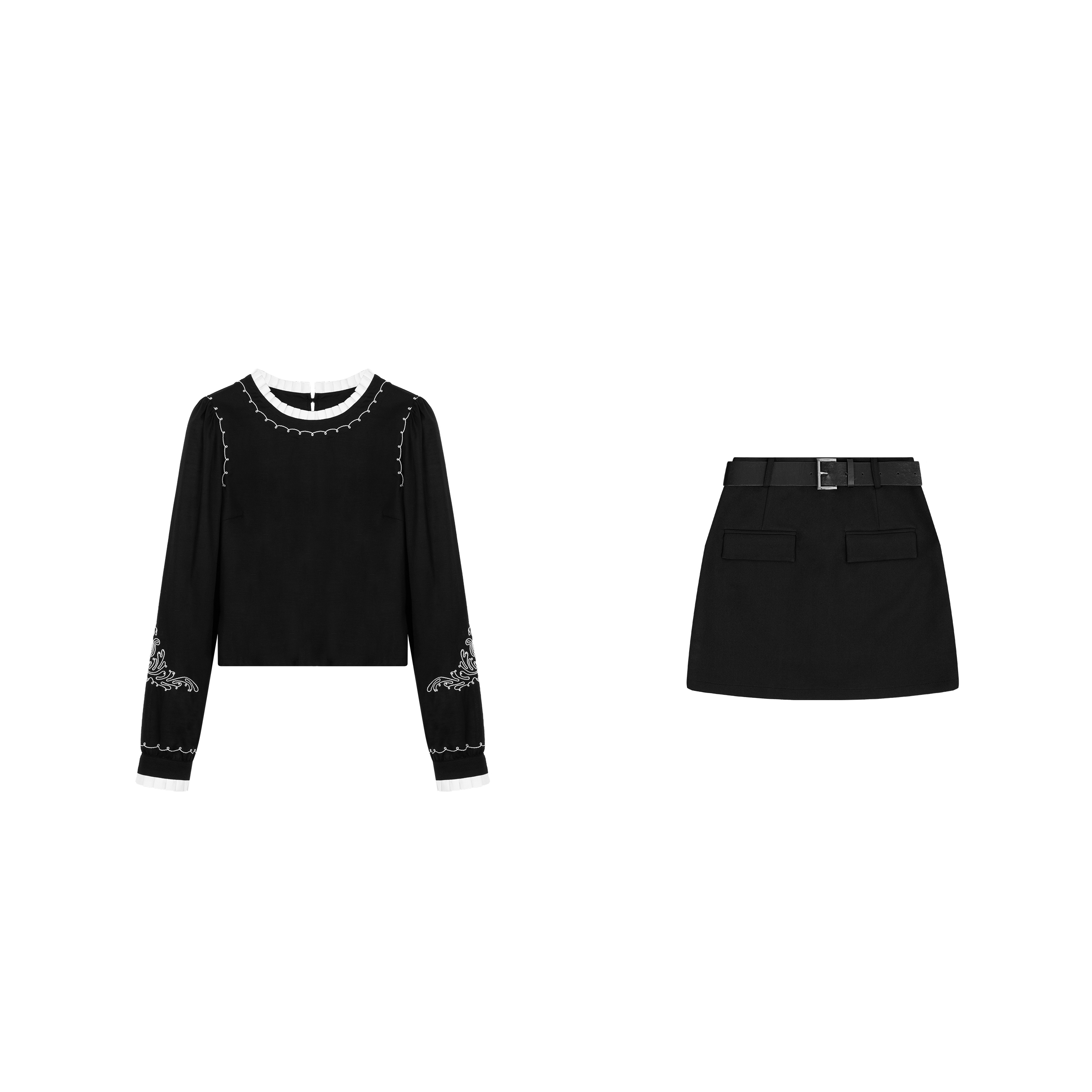 乔拉【月下颂歌】木耳边撞色圆领刺绣上衣女时尚套装a版半身裙子