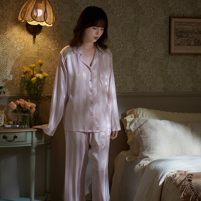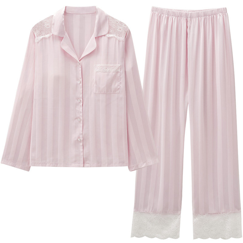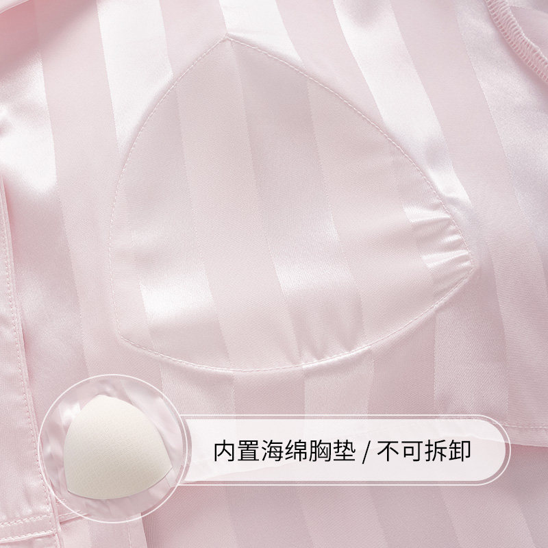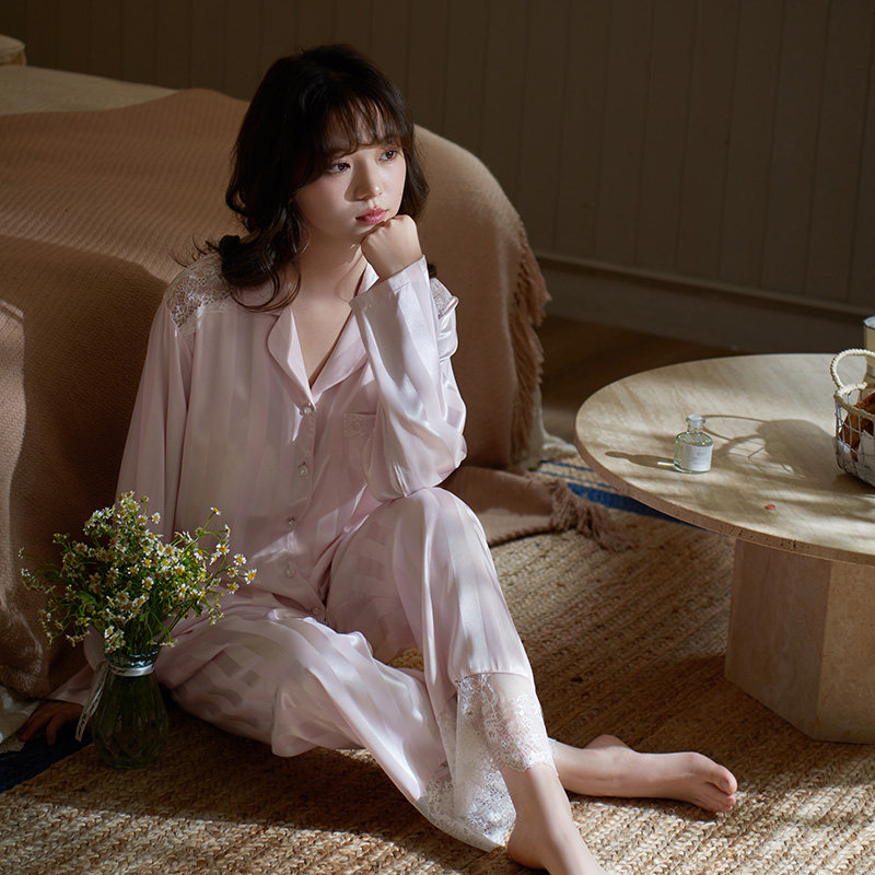 马克公主带胸垫睡衣女仿真丝绸长袖时髦条纹套装蕾丝家居服春夏季