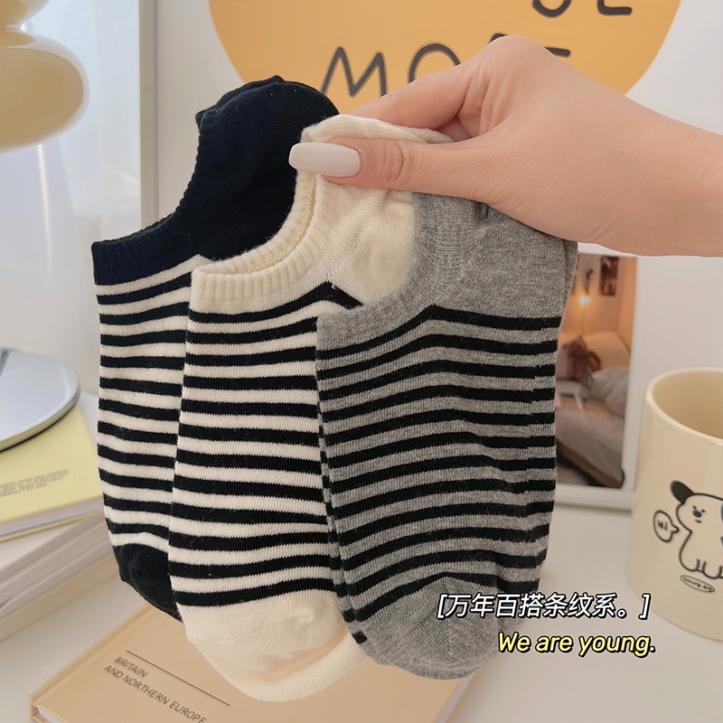 袜子女船袜防滑不掉跟春秋季薄款ins潮韩版百搭黑白条纹短袜秋天