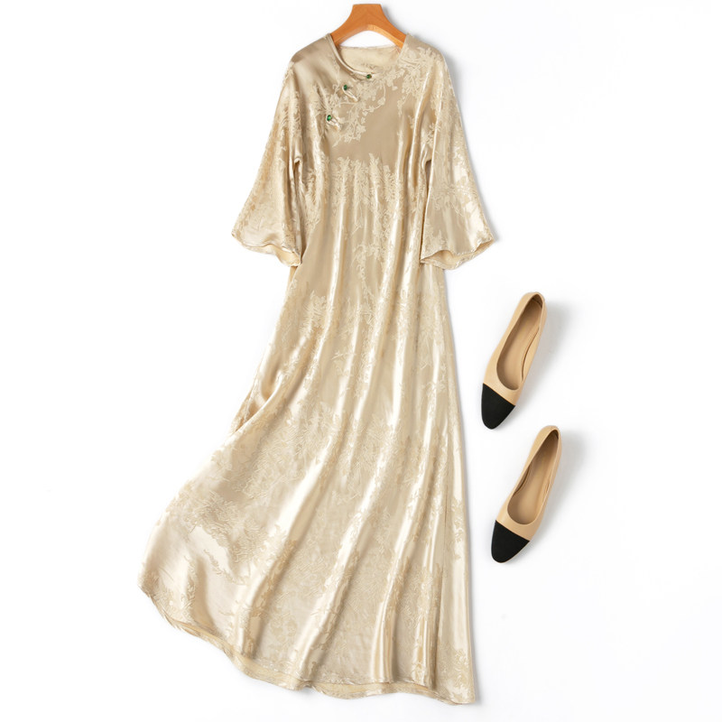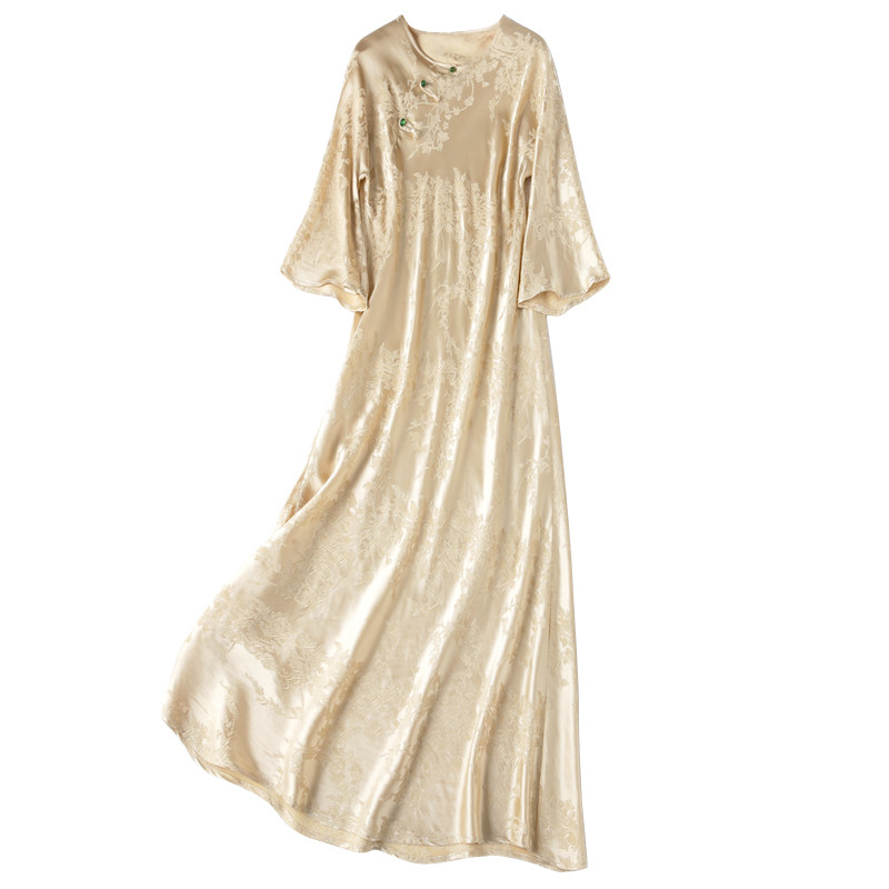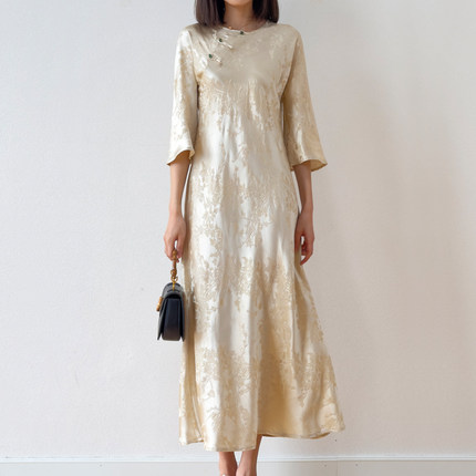 气质米!斜裁新中式!中国风桑蚕丝连衣裙真丝冠乐缎浮雕修身旗袍