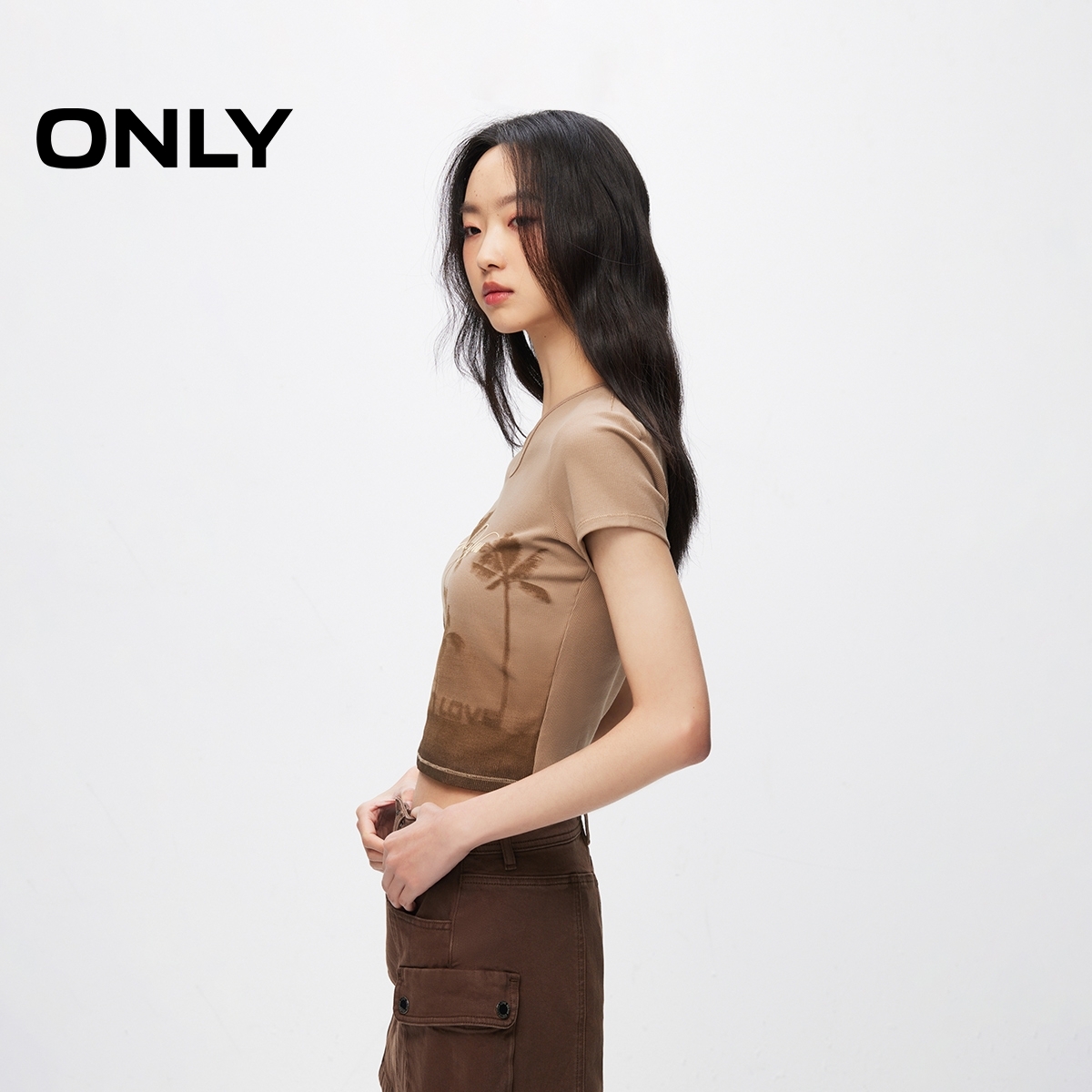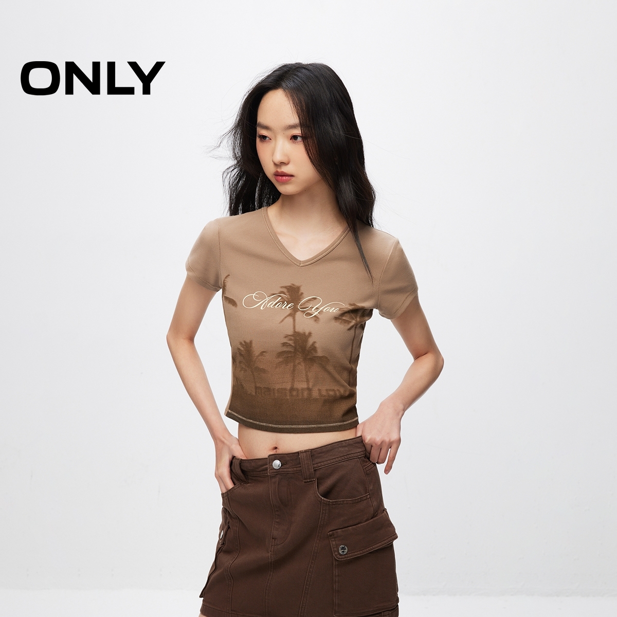 【ONLY奥莱】夏季潮流复古印花V领修身正肩短款T恤女