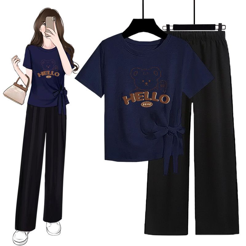 韩系气质松弛感套装女设计感绑带藏青色显白短袖T恤+阔腿裤两件套