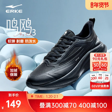 鸿星尔克运动鞋男加绒跑步鞋黑色通勤鞋皮面防水跑鞋冬季男鞋棉鞋
