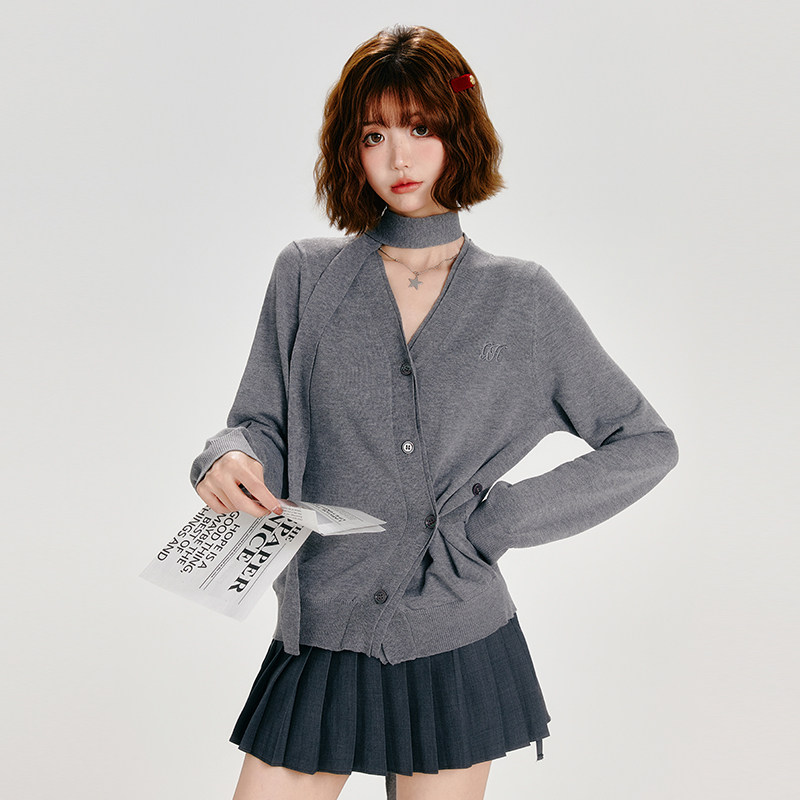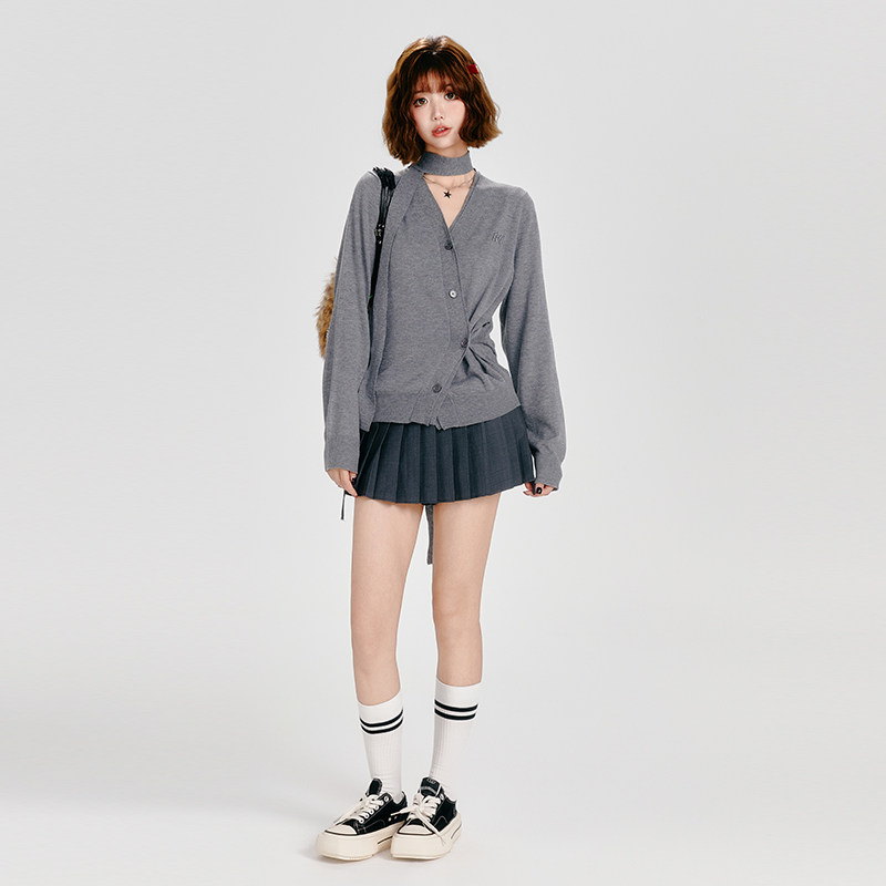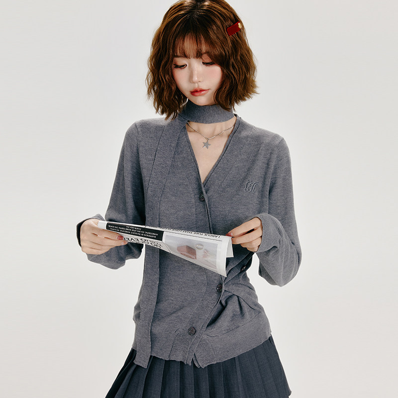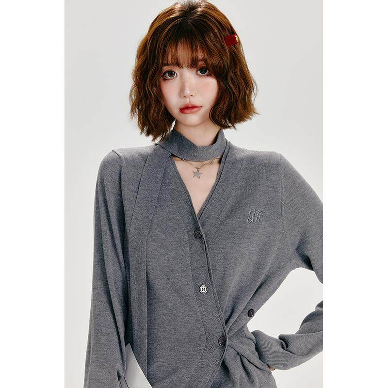 Girlyhalo不规则开衫V领针织衫女秋季新款设计感慵懒简约百搭上衣