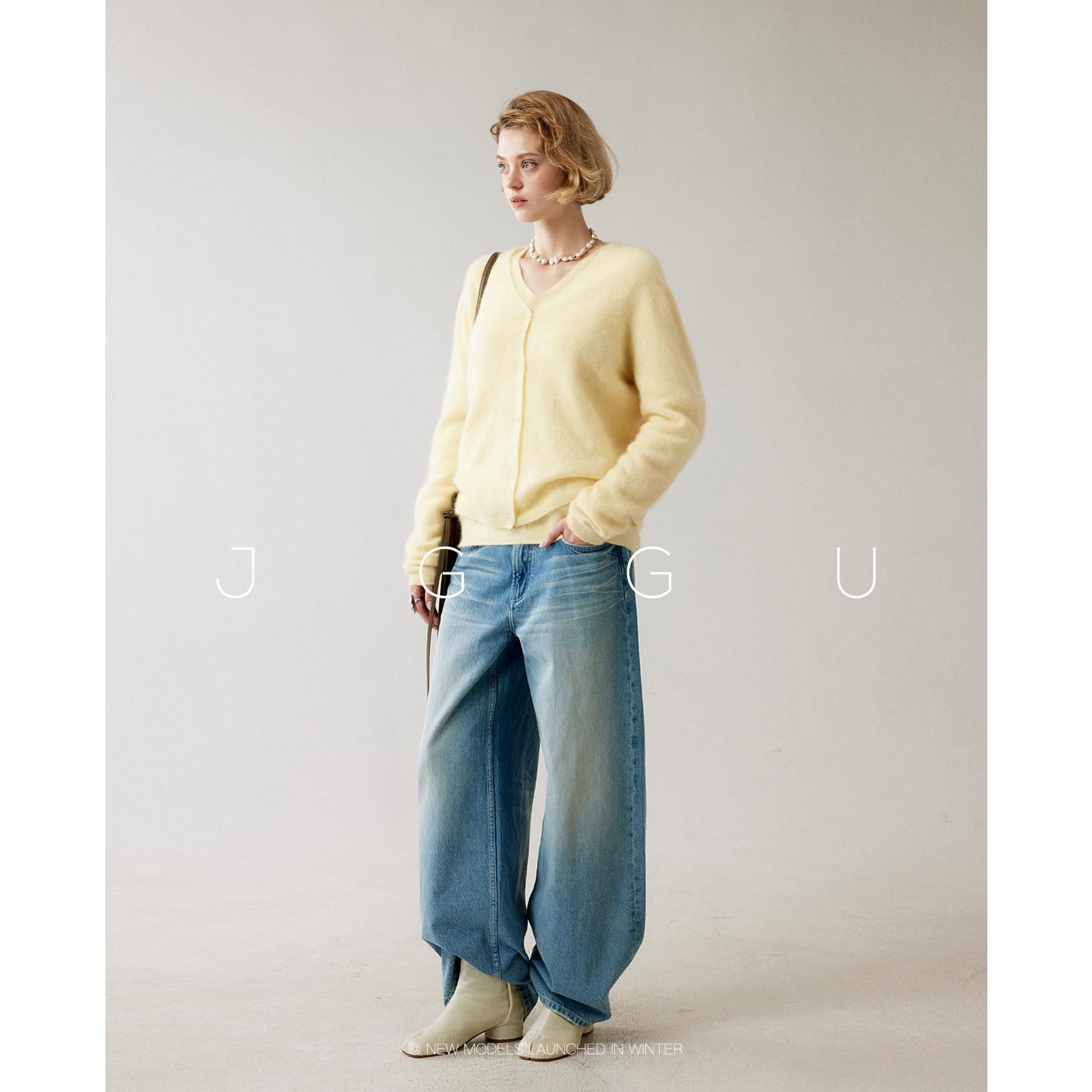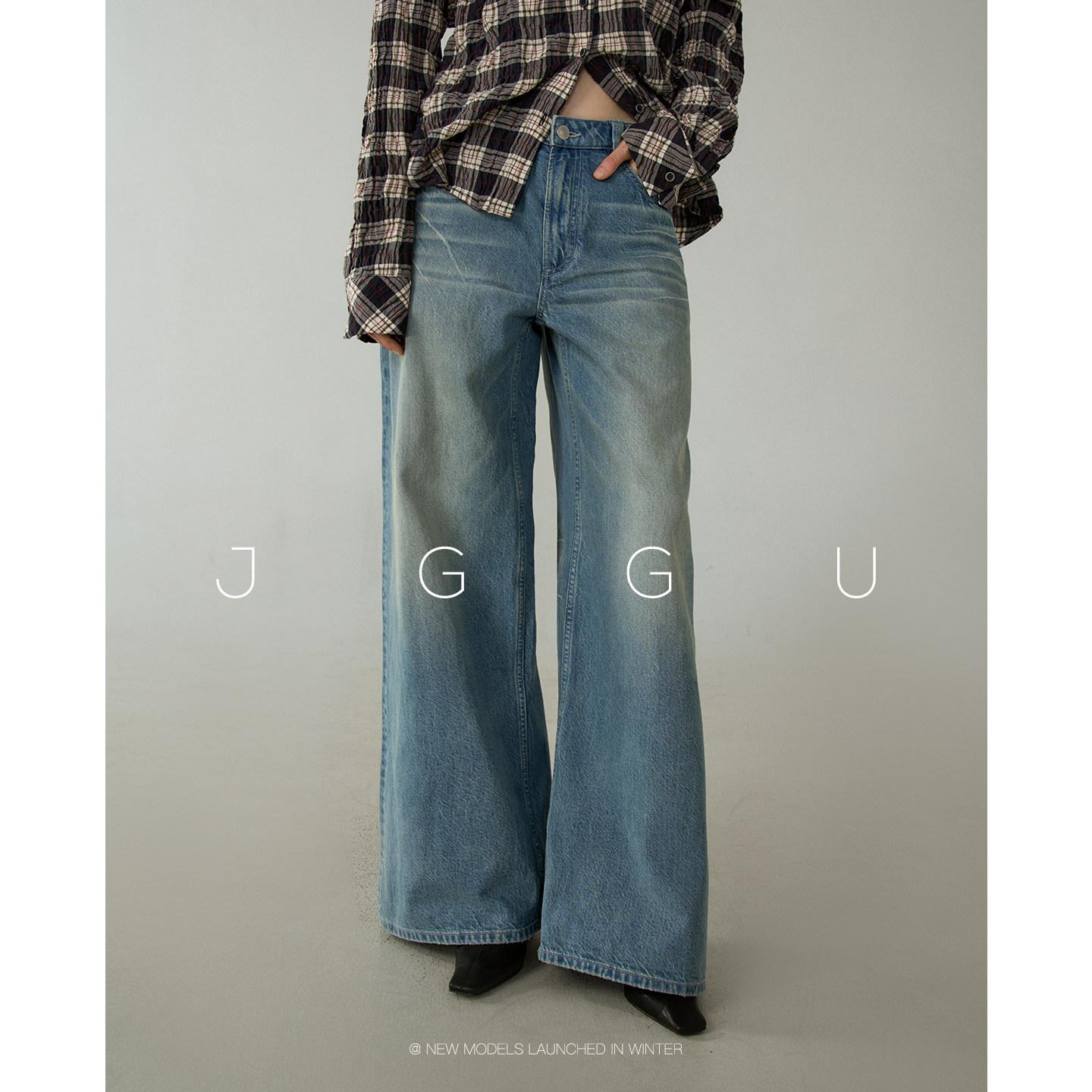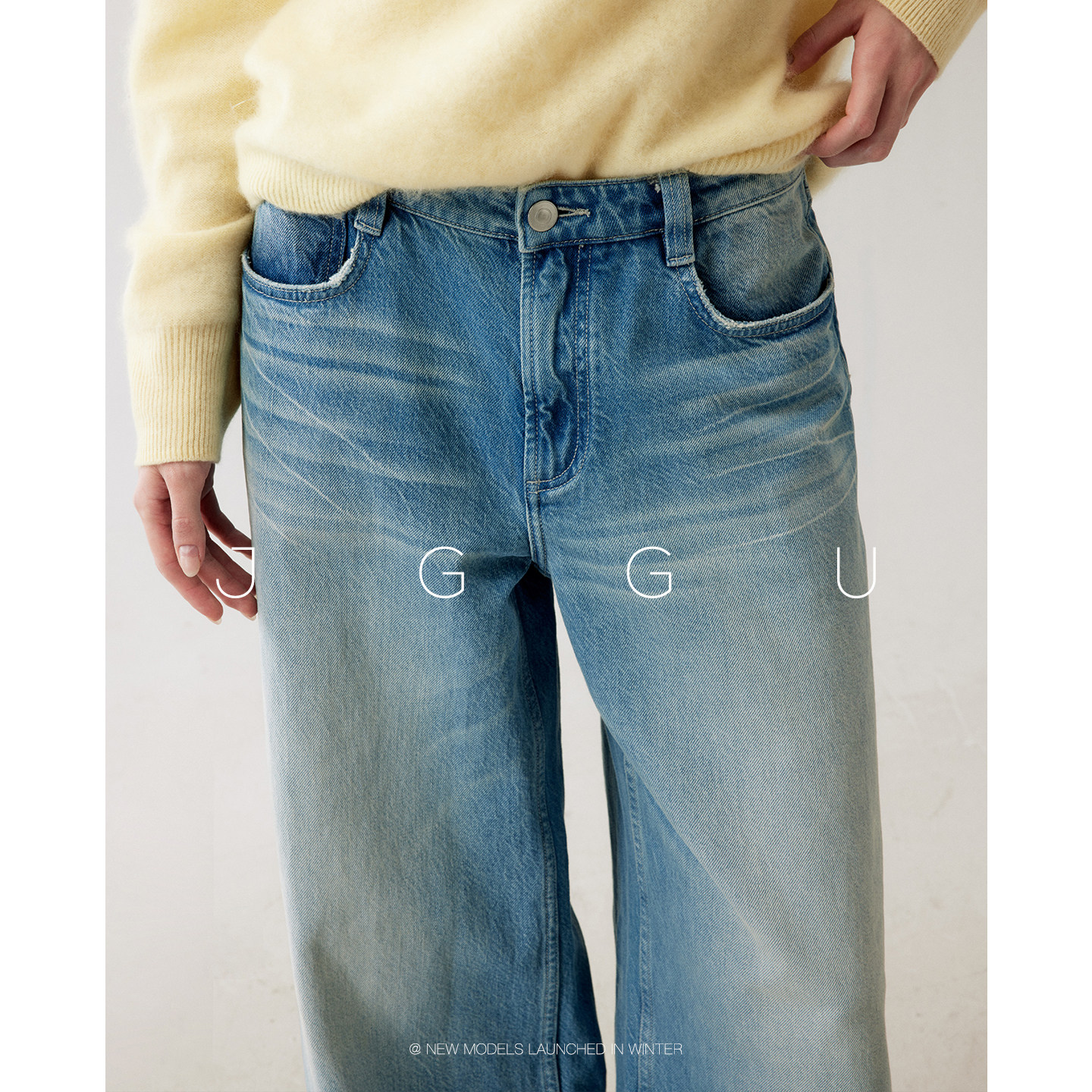 晶咕黑标JGGU【漫步旧巷】土耳其进口棉水洗蓝直筒牛仔阔腿裤女冬
