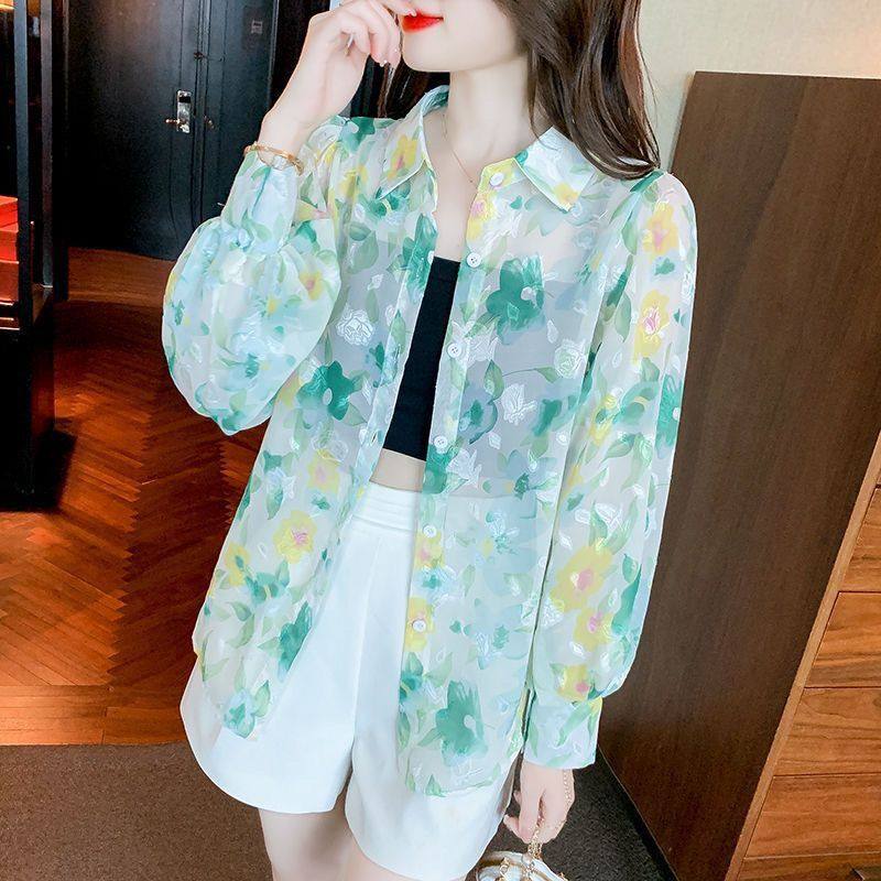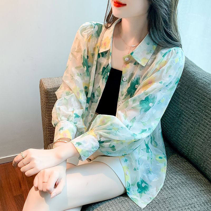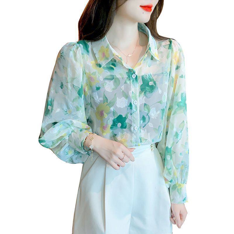 宽松灯笼袖衬衫女2025春秋薄款小清新碎花开衫防晒衣长袖雪纺衬衣