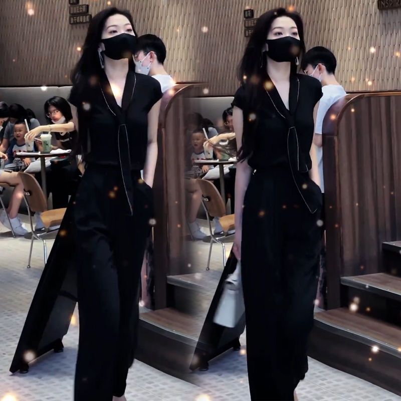 网红气质时尚套装女夏季轻奢高端领系结短袖背心上衣直筒裤两件套